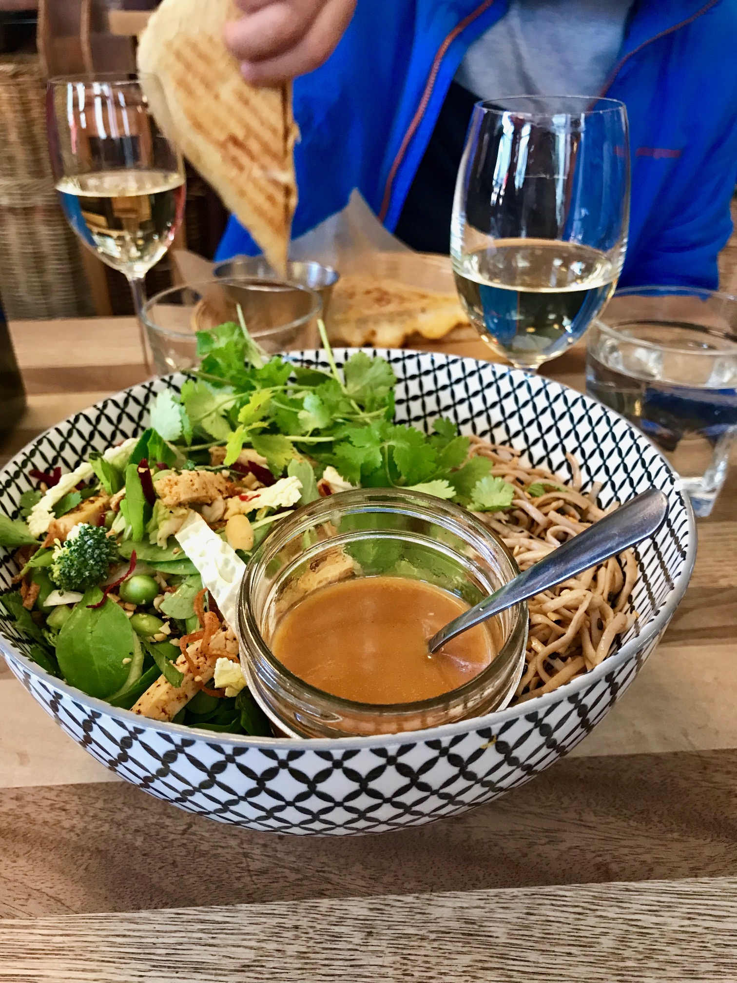 O&G was worth the wait. The energy was buzzy and cozy and you could tell instantly that the place was a real Montreal institution. We split a soba noodle salad with tofu, edamame, and greens and a grilled cheese made with raclette, gouda, and caramelized onion. We also ordered two glasses of Muscadet — you know you’re old when a glass of wine in the middle of the day feels like about the most rebellious thing you can do.
