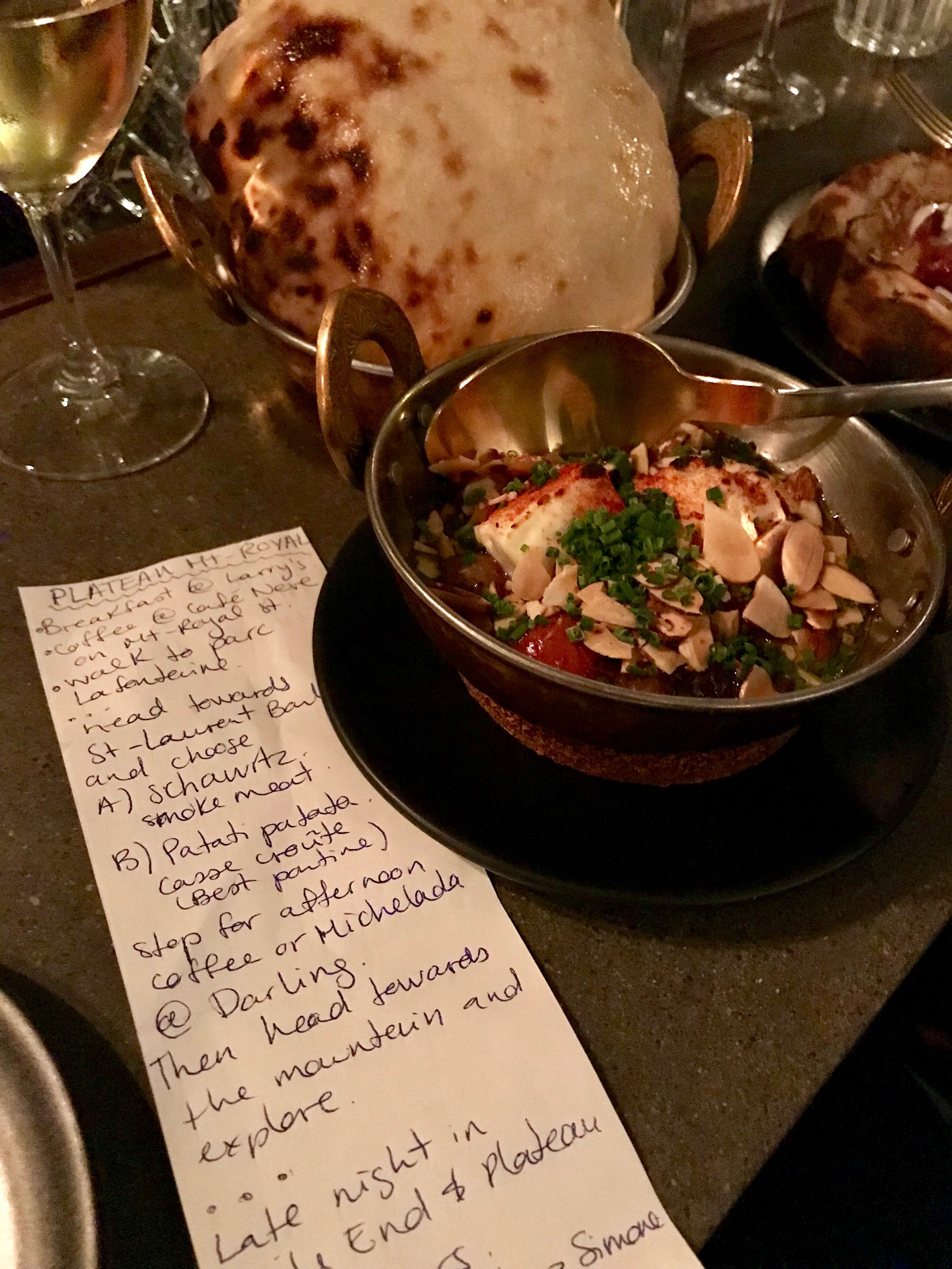 Friday dinner was at Foxy, the culinary highlight of the trip, maybe one of the culinary highlights of my year. If Montreal is a city that’s made for winter, this is the restaurant that is made for a winter city. Warm and inviting with a roaring wood-fire oven in the back room, it’s exactly how I’d eat every night in cold weather if I could. Almost everything is cooked in the wood-fire oven — pizzas, smoked meats and fish, flatbreads. This is a terrible photo, but it was imperative that I document the dish that I want to remember forever: A oven-baked feta with concord grapes, almonds, and currants served with warm, puffy flatbread. If ordering that was the smartest thing we did at Foxy, the second smartest thing we did was reserving two seats at the bar so we could have access to our excellent bartender, Daphne. Reminder: When visiting a new city, always ask your bartender or server for their favorite local places. Foxy was out-of-control busy — especially the bar — but before we left, Daphne handed us this sheet of paper outlining an ideal Saturday itinerary for her home town. I mean, seriously. If that’s not the best service…