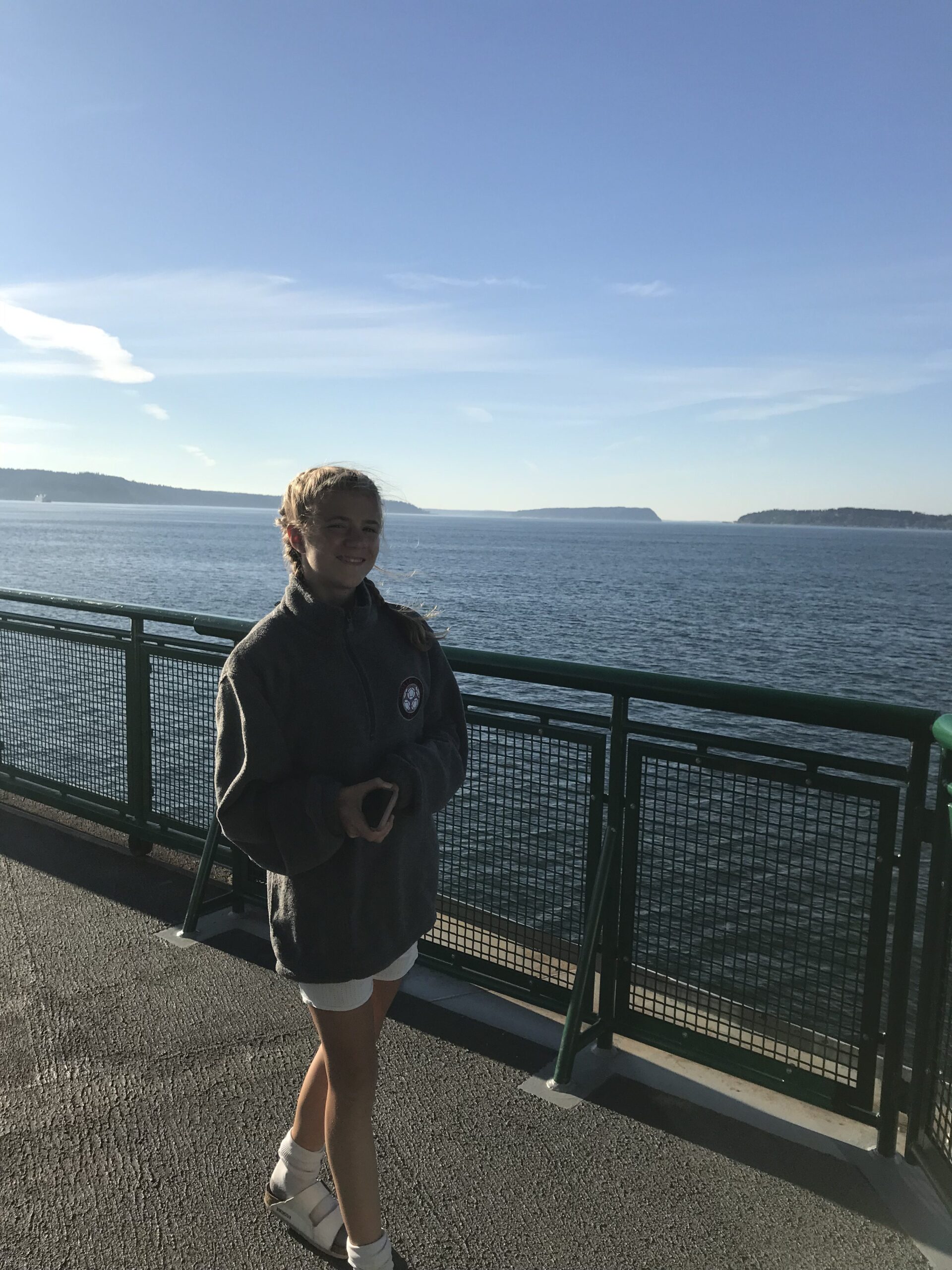 6:00 [Abby] After my soccer game (lost 2-1) we drove to Mulkiteo and caught a ferry to Whidbey Island, about 25 miles north of Seattle across the Puget Sound, where Jenn and Ben have the sweetest cabin. The ferry was only about 25 minutes, but involved spectacular views of islands and huge mountains in the distance.