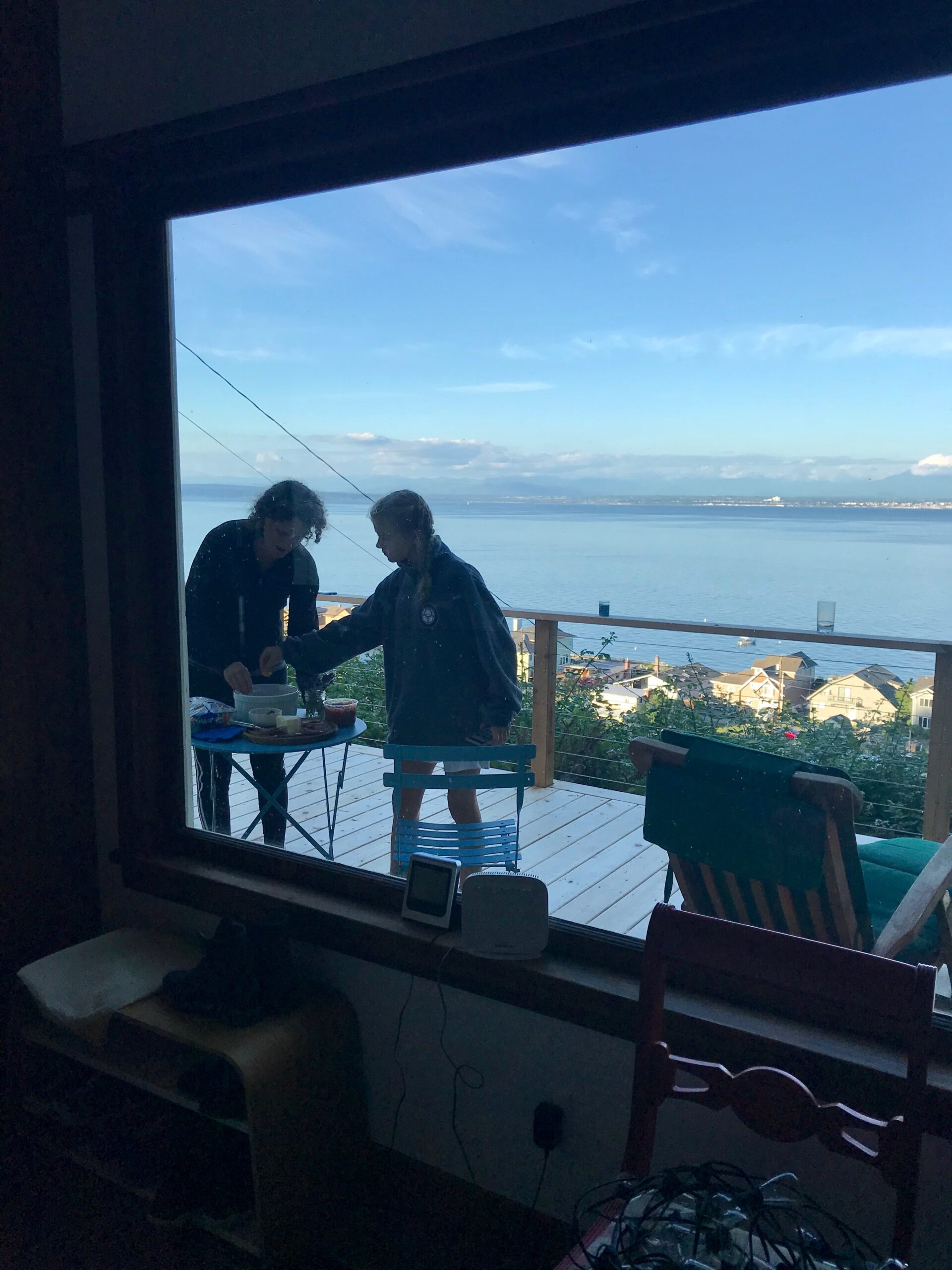 7:30 We only had about 12 hours to hang on Whidbey, but we got a good taste of it, snacking on their porch (above), chilling out by the campfire for an epic sunset; Ben grilled some local salmon and hot dogs for dinner. The house only had two bedrooms so my mom and I got to sleep in a tent listening to the crackling campfire.