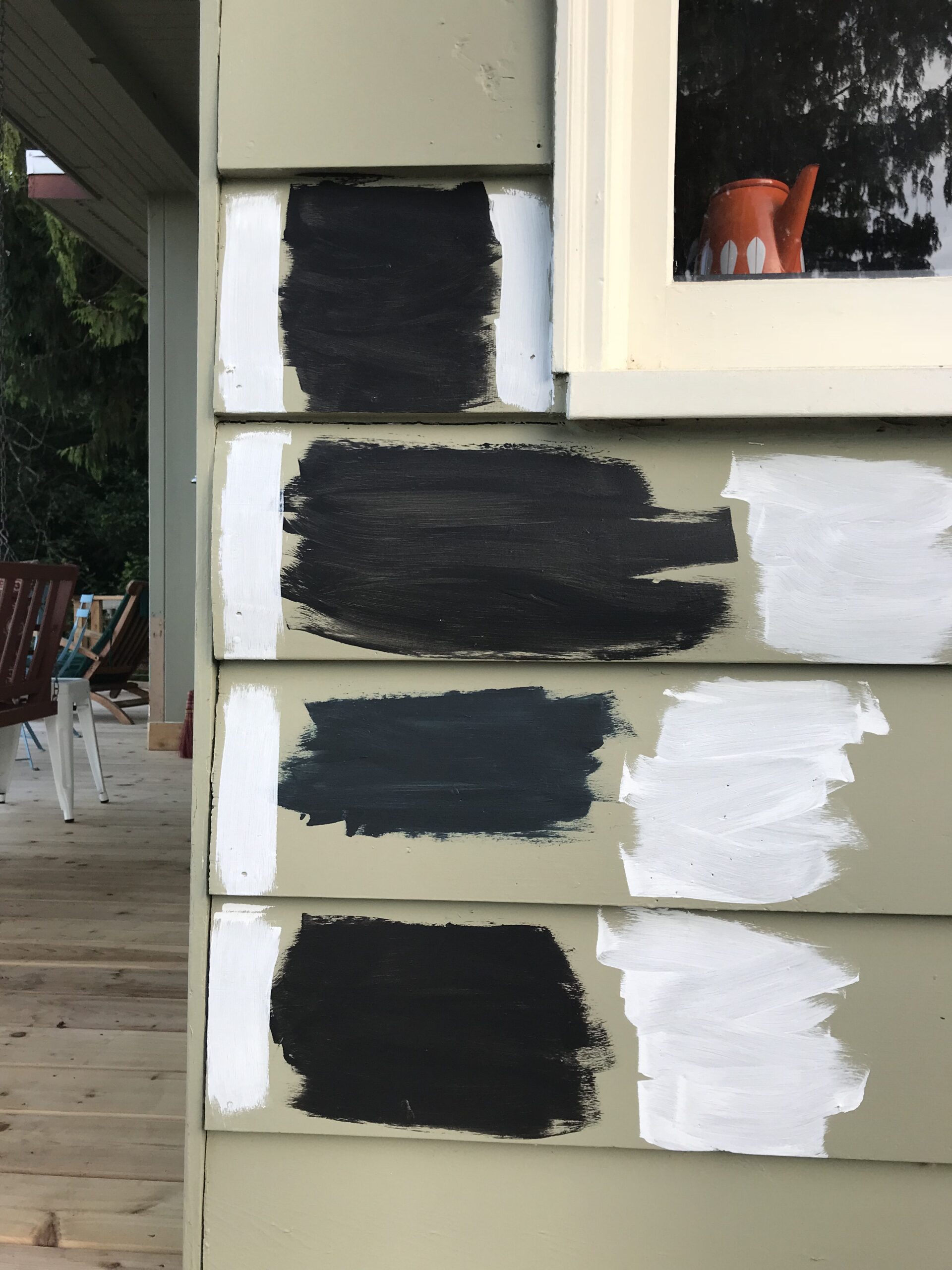 Side Note [Jenny] Those of you who follow me on instagram might remember this photo. Jenn and Ben were torturing themselves trying to decide what color to paint the cabin — they were going for a dark Scandinavian cottage look — so I conducted an insta poll asking which combo you all liked. Most of you were in favor of the navy/white palette, the third one down. Last week, she sent me this pic: