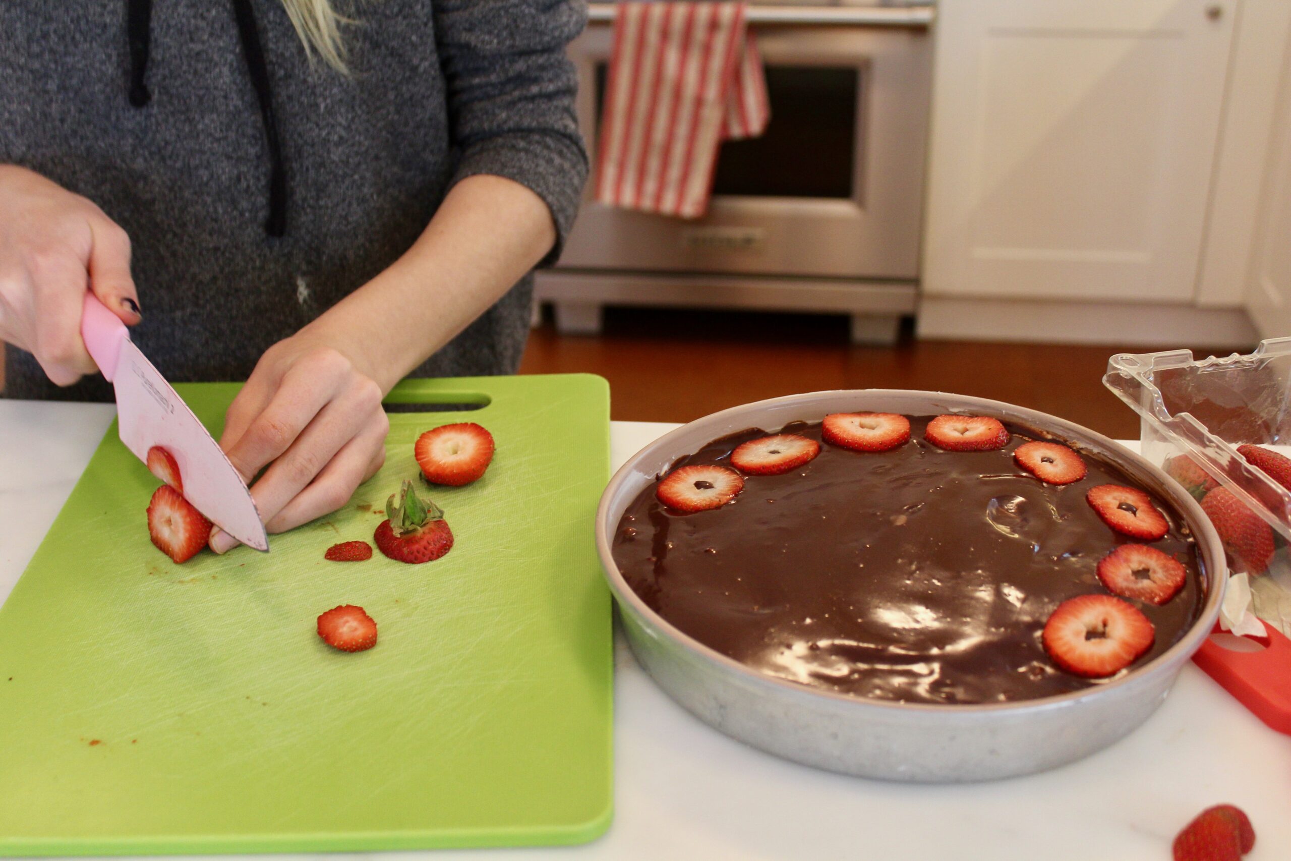 Plus, her taste is getting more refined. Occasionally, she’ll stumble upon a recipe that includes no fruity pebbles or marshmallows. In fact — and I take this as a sign of maturity — occasionally she’ll stumble upon a recipe that she thinks can be improved upon by simplifying. Remember Coco Chanel’s rule of fashion? Before you leave the house take one thing off. This is the rule she applied to So Yummy’s Oreo Chocolate Cheesecake with Strawberries and Nutella Drizzle. She decided to take off the Nutella Drizzle. Second time around, she decided to replace the Oreos with Graham Crackers and dial back the chocolate ganache…