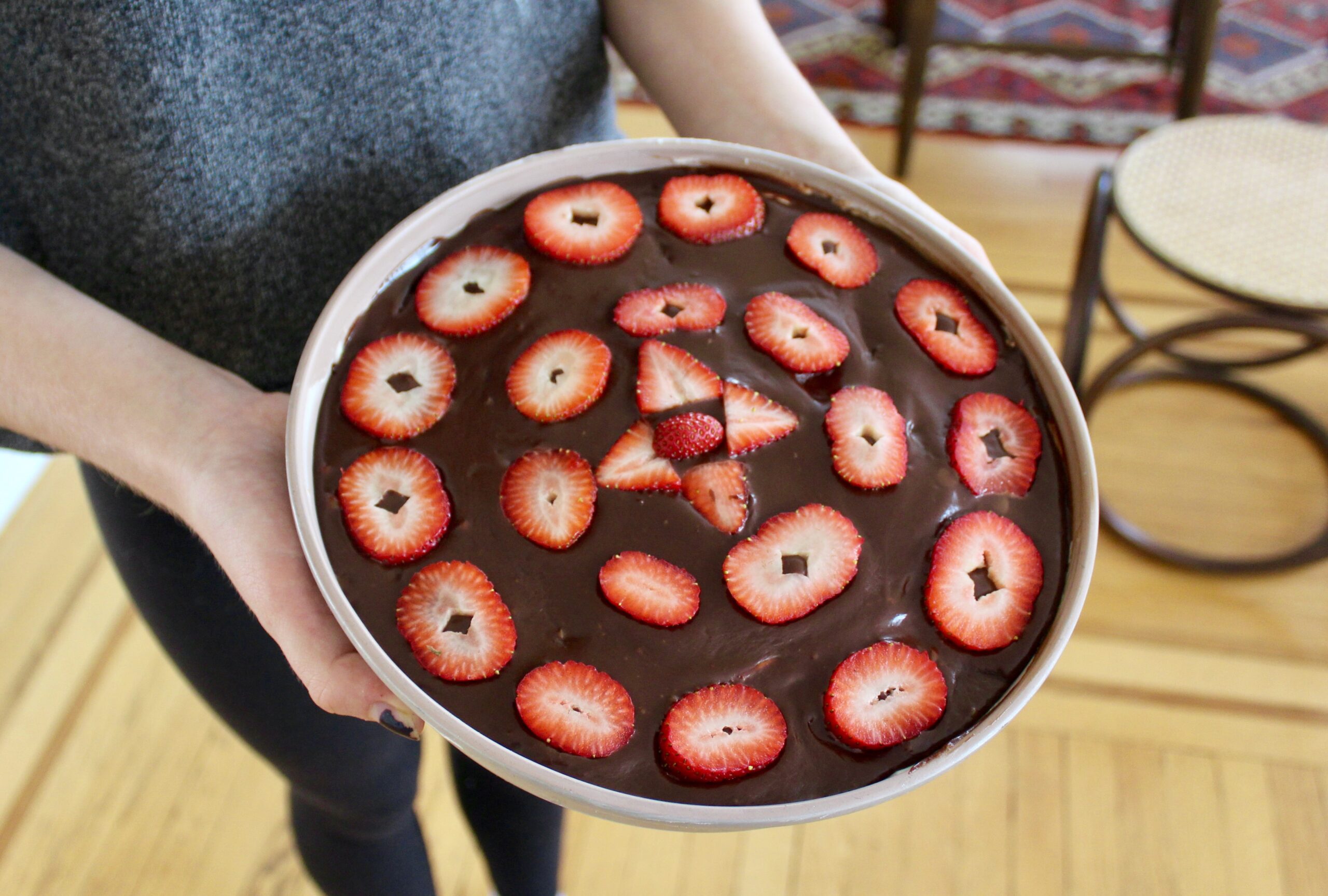 Pour the ganache filling over the set cream cheese filling and top with sliced strawberries. Chill for an hour (remove from springform pan if you used one) and serve.