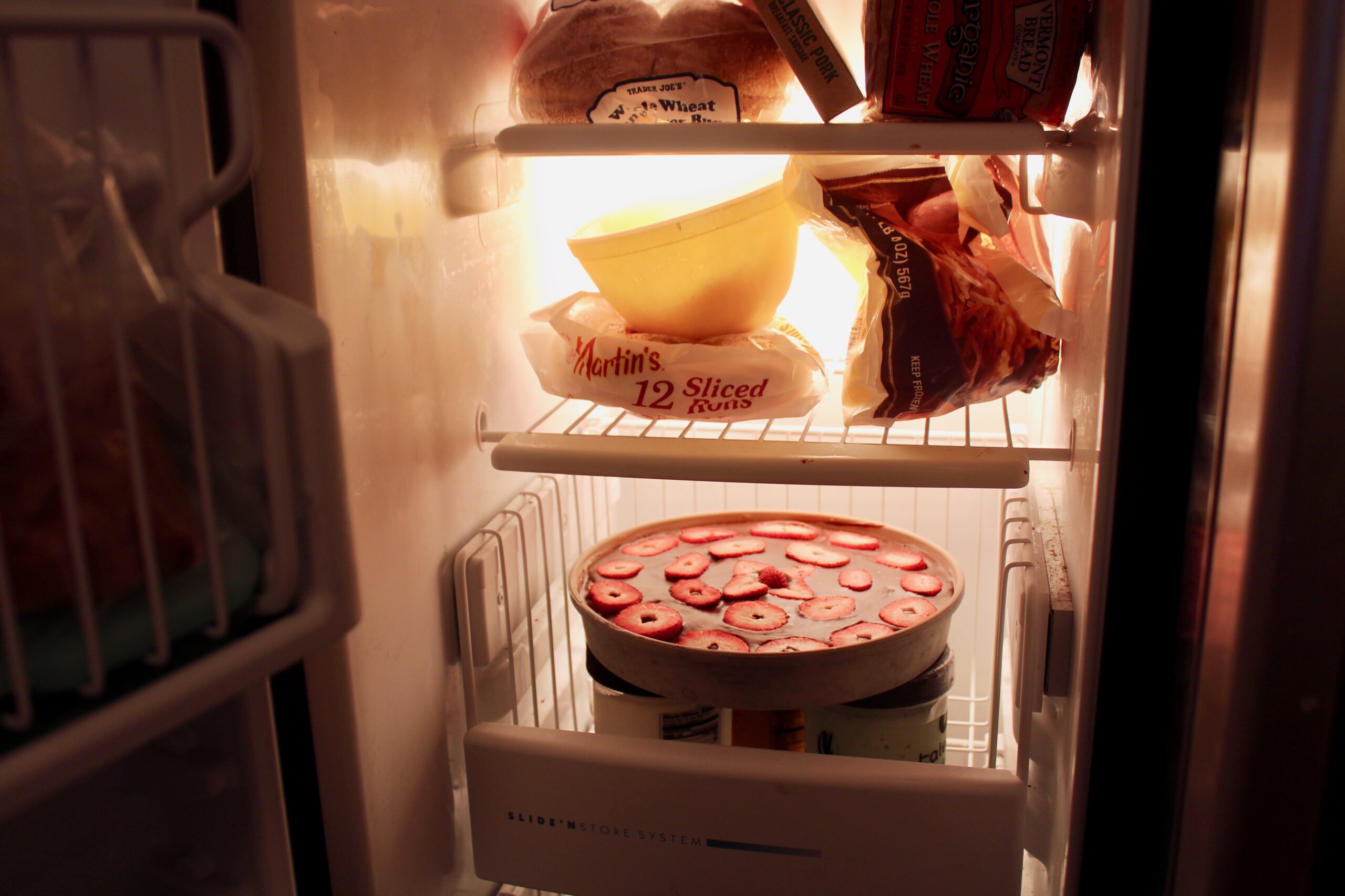 Mix graham crackers and melted butter until combined, then pat the mixture firmly into the bottom of a 9-inch springform cake pan. (Abby used a regular round 9-inch pan and it was fine.) Freeze for 10 minutes.
