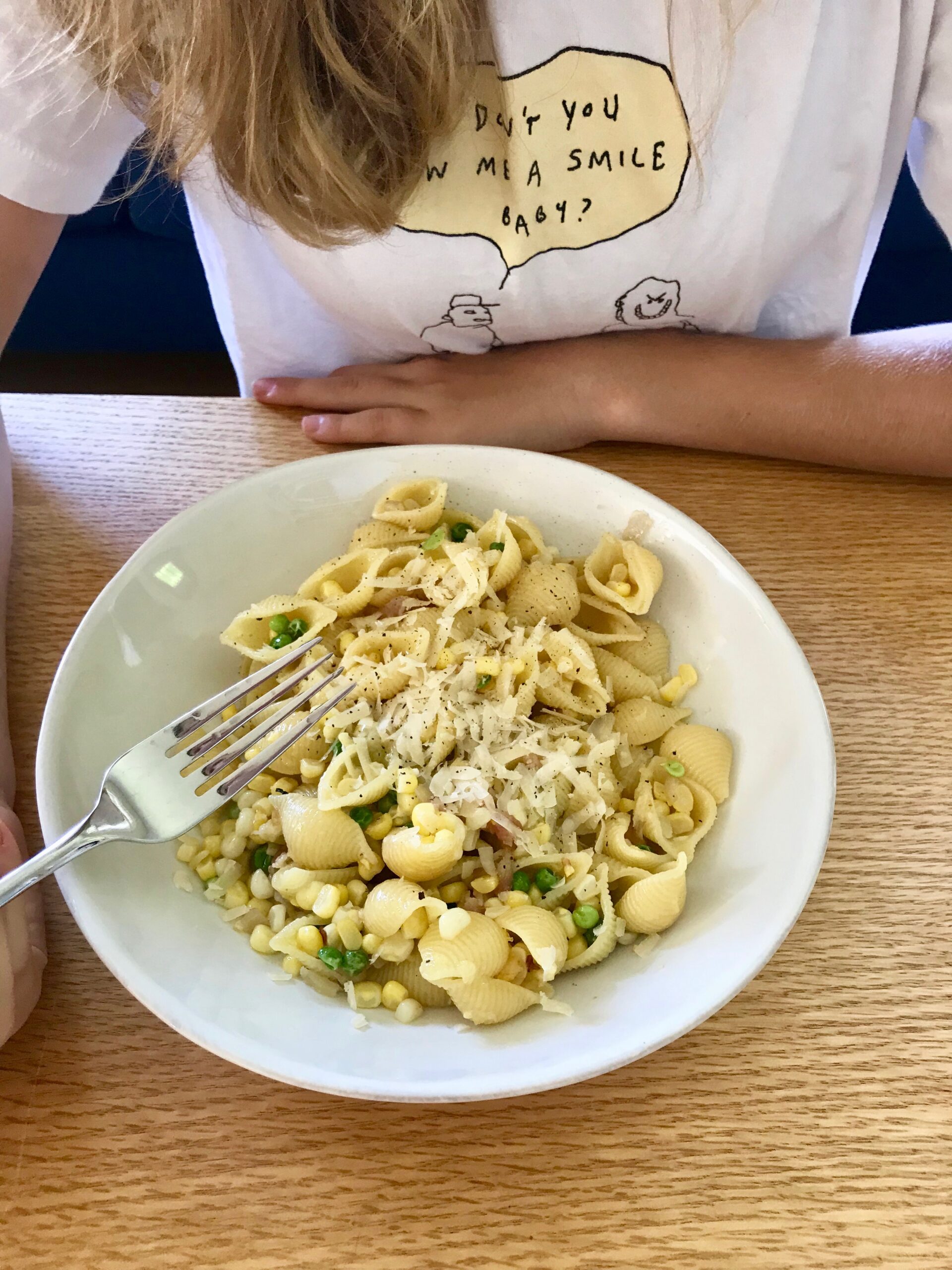 Shells with Peas, Corn, Bacon, and Pecorino