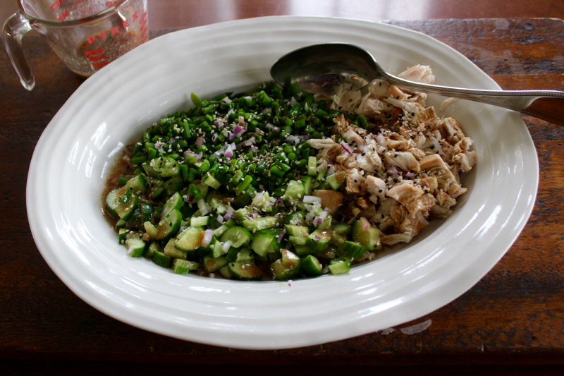 5:30 Home. Simmer and shock asparagus; chop up chicken, onions, cucumbers, asparagus.
