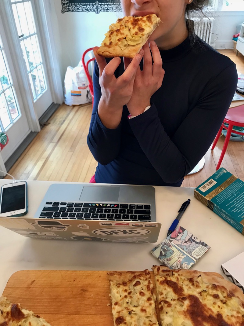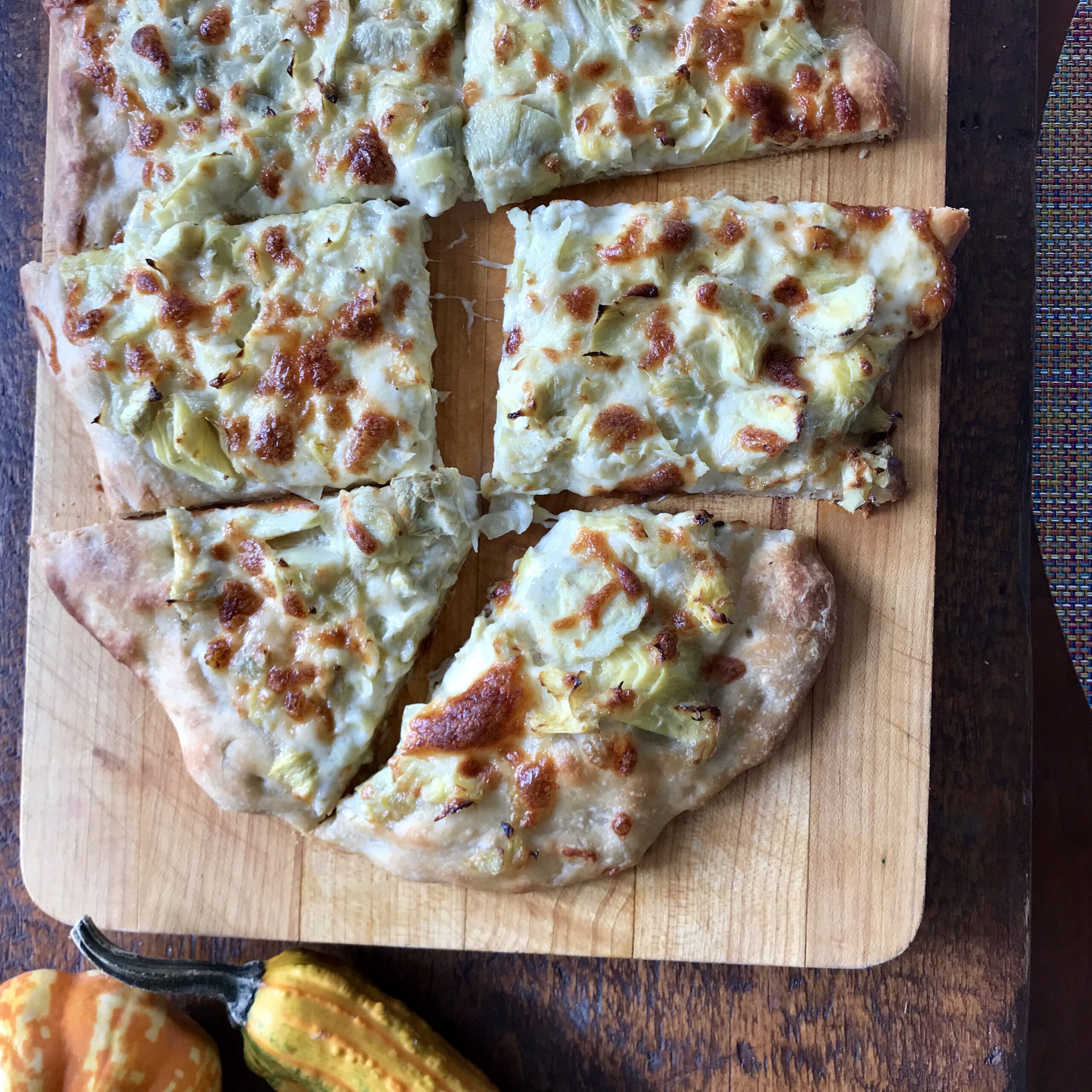 On Saturday, while I performed my weekly-ish refrigerator dump to clear the way for new groceries, I threw two heels of Parmesan and three nearly depleted bags of shredded mozzarella on to the counter. Who knows how or why, but as clear as day, a voice inside me announced: Artichoke Dip. Even though it was before noon. And even though I wasn’t entirely sure if I had a can of artichokes in the pantry. And then, after removing a Trader Joe’s pizza dough from the back of the second shelf, sitting next to the yogurt that expired back when I was still wearing shorts, another voice declared: Pizza. It’s still such a mystery how this stuff happens, but when there’s divine intervention of the food kind, I don’t ask questions, I just get to work.