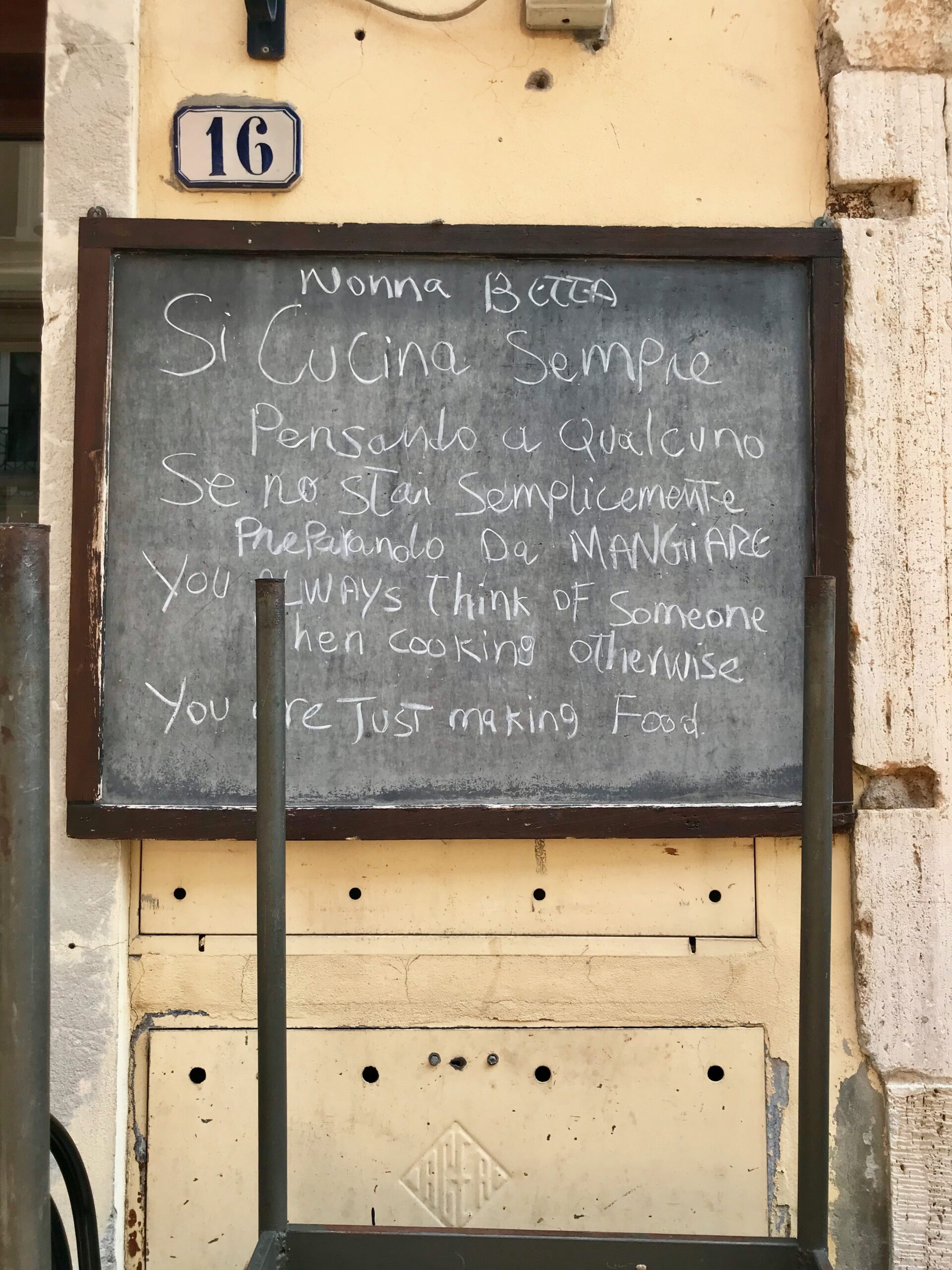 And I’ll leave you with a nice little reminder no matter where or what you are cooking. It was written on a chalkboard outside Nonna Betta, a popular Roman/Kosher restaurant in the ghetto: “You always think of someone when cooking, otherwise, you’re just making food.”