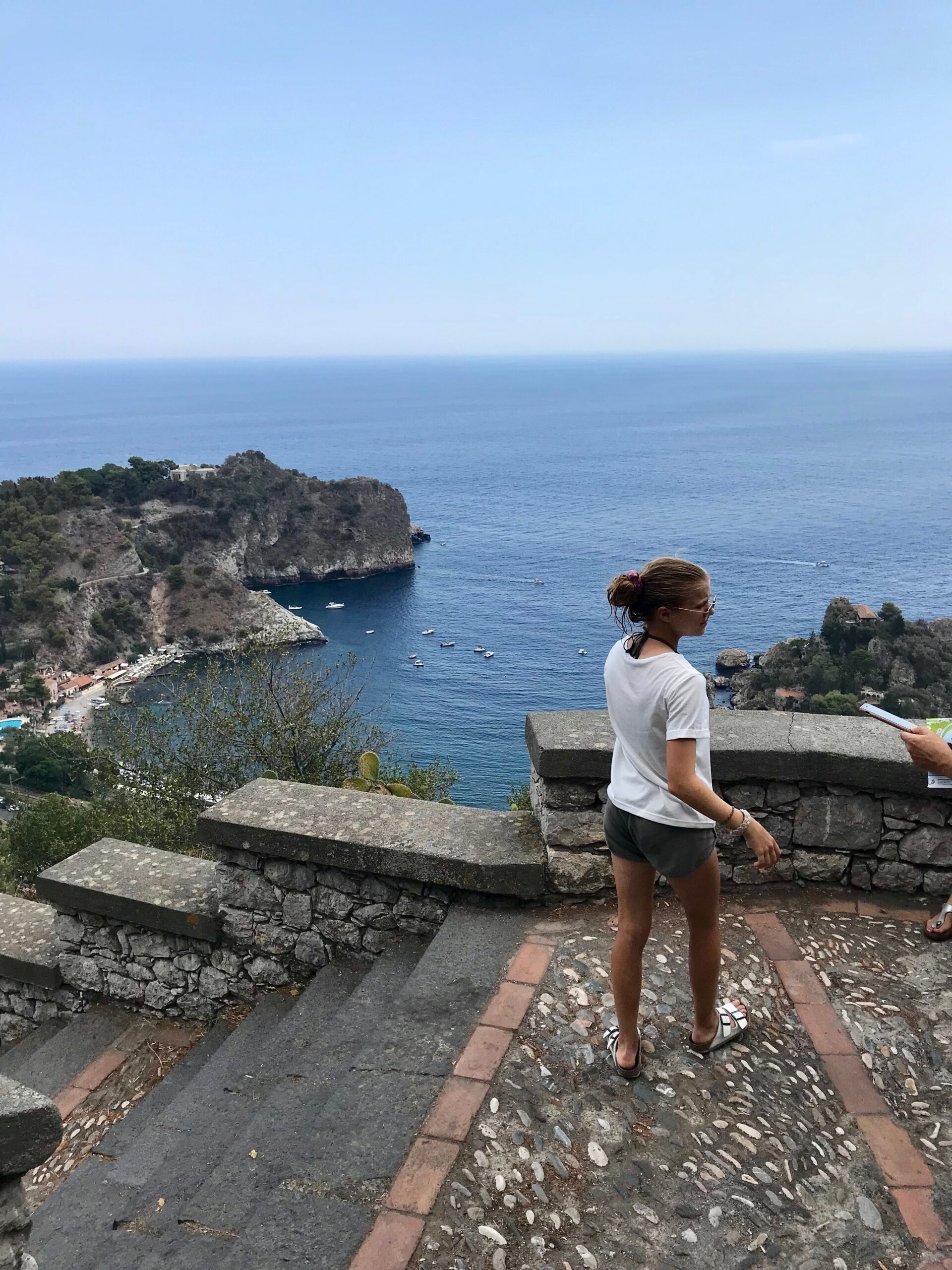 The second meal we made at home was in Taormina, Sicily, where, at every turn, you see a view of the Ionian Sea that looks like the above. Naturally, we were craving seafood. And it’s not like we were sick of pasta and pizza and focaccia and arancini (not even close), but a light dinner appealed to all of us, especially if we could find something local and fresh and pair it with…a spritz.