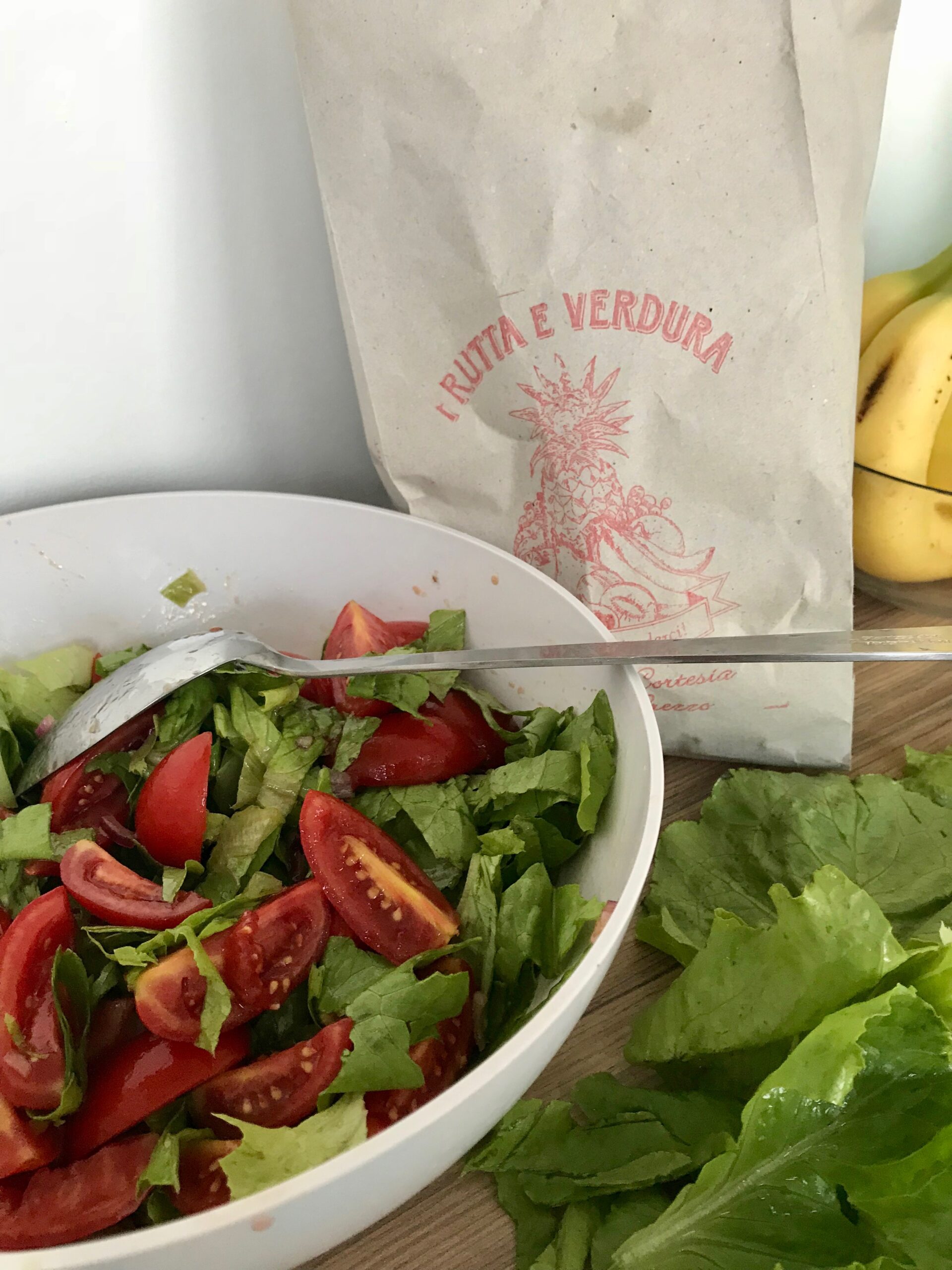 Andy pan-fried the steak, sliced it up and we tossed it with tomatoes, greens, and shallots (procured from a produce stand on our street; look at the beautiful bag the vendor gave me to hold the bounty) and bocconcini, balsamic vinegar, olive oil, which the airbnb miraculously had in the pantry. I might’ve added parm or grana instead of the mozzarella, but trust me, I’m not complaining. It was fresh and light and left us with just enough room in our bellies for a gelato up the hill.