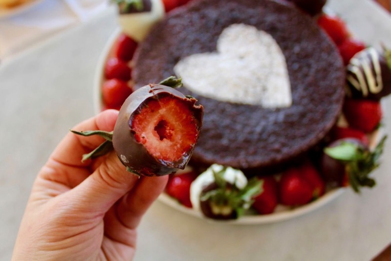 Once your cake is cooled, freeze one (for later consumption) and then place the other on a large round platter (there should be at least an inch perimeter of plate around the edge of the cake). Place a piece of parchment paper over the surface of the cake, tracing the edges with a marker, outlining a circle. Cut out the circle, then draw a medium-size heart in the center of the circle. Cut out the heart so your parchment has a heart-shaped hole in the middle. This is your stencil. Lay on top of your cake and shake powdered sugar on top. Carefully peel back parchment to reveal the heart. Place strawberries and chocolate covered strawberries around the perimeter and serve.