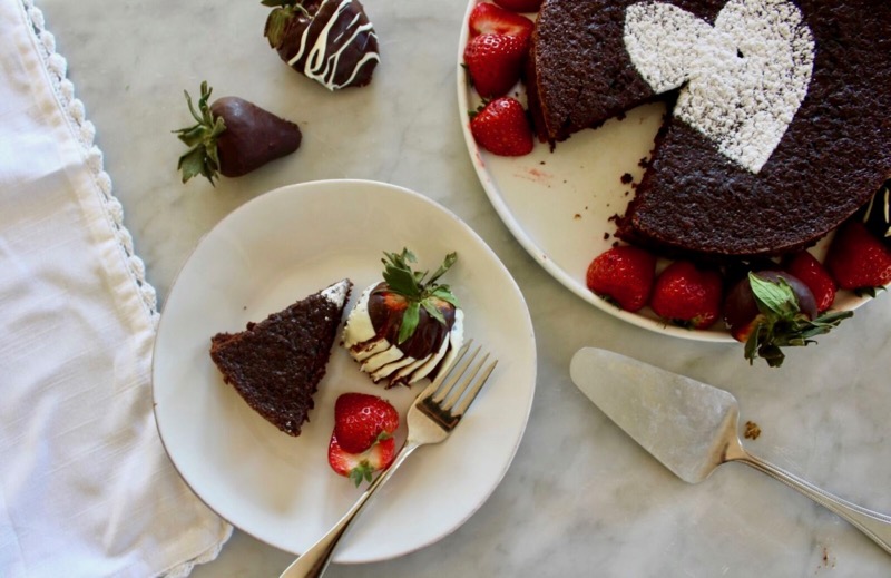 Mud Cake with Chocolate-covered Strawberries OR Sweetheart Cake from Whole Foods Bakery