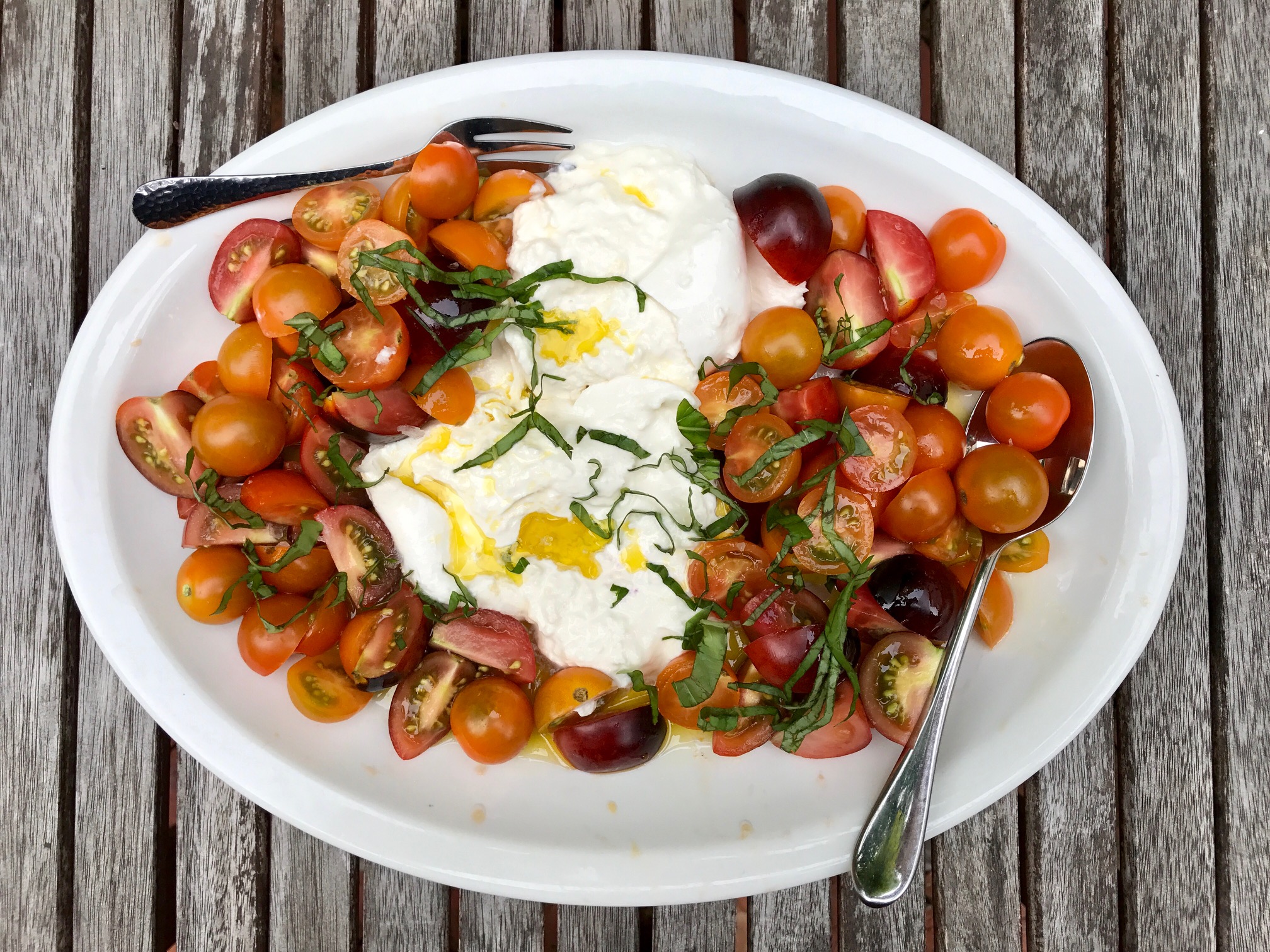 (Above: Sliced candy-sweet cherry tomatoes with basil, olive oil, sea salt, and a creamy, milky burrata that should be scooped up in every bite; Seriously, if you just add a baguette, it’s dinner.)