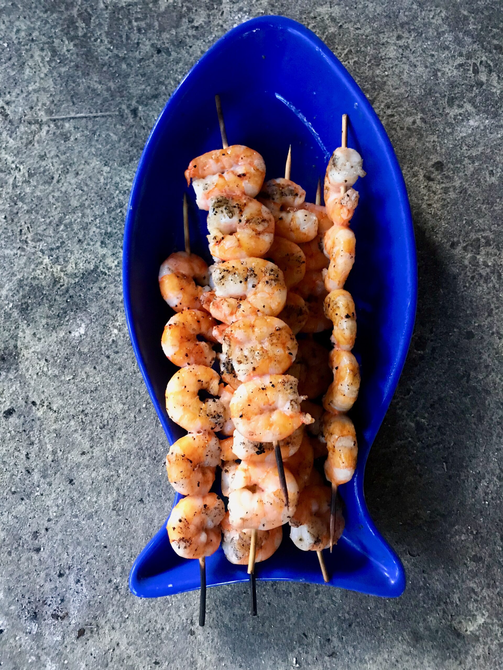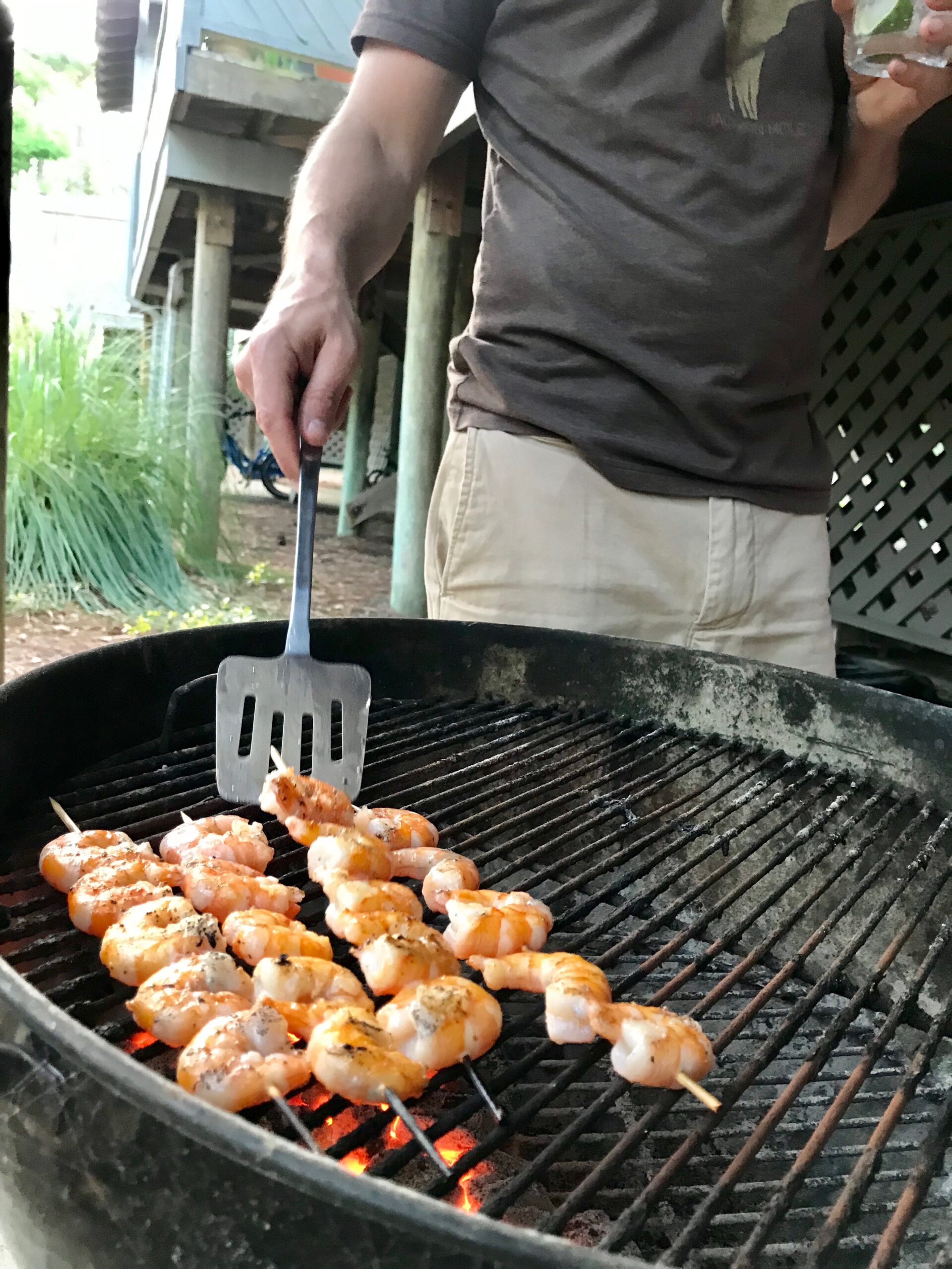 Thread your shrimp on to skewers, all the same direction, so they’ll all lay flat on a grill. (As shown in grilling pic.) Season shrimp with salt and pepper, then brush lightly with olive oil and little hot sauce. Prepare your grill.