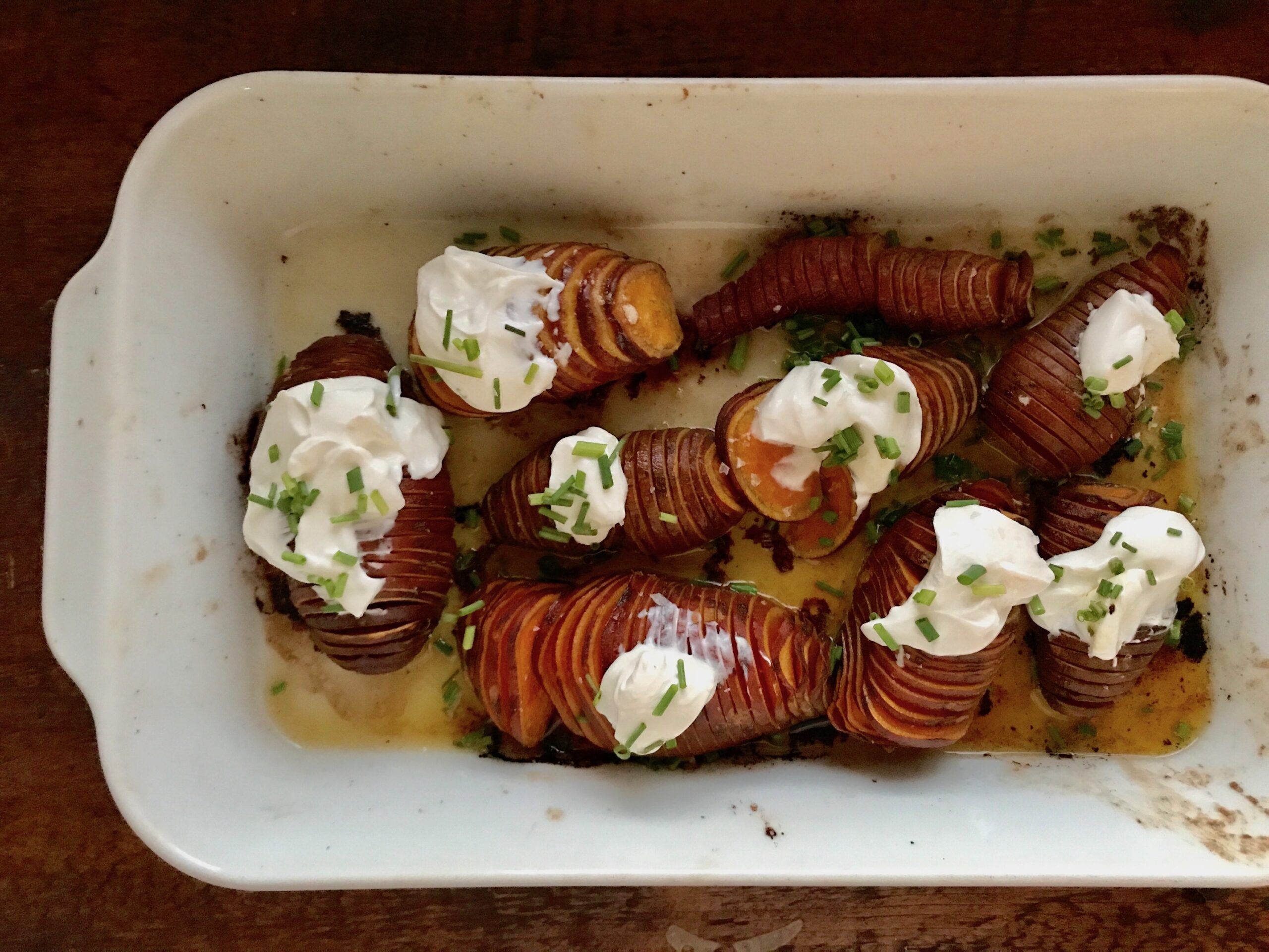 Hasselback cutting is made much easier with either chopsticks or wooden spoons on either side of the sweet potato. They act as a guide/barrier for overzealous slicing (on my part anyway).