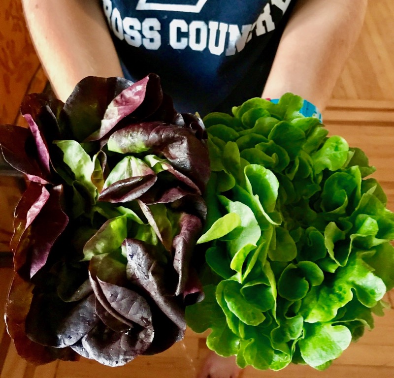 By the time Sunday dinner rolled around, we were ready to right the ship with those grilled pork chops and a salad made with bunches of greens that looked like bridal bouquets. The vendor at the market told me they were some version of Bibb, but I can’t for the life of myself remember…maybe red oak….