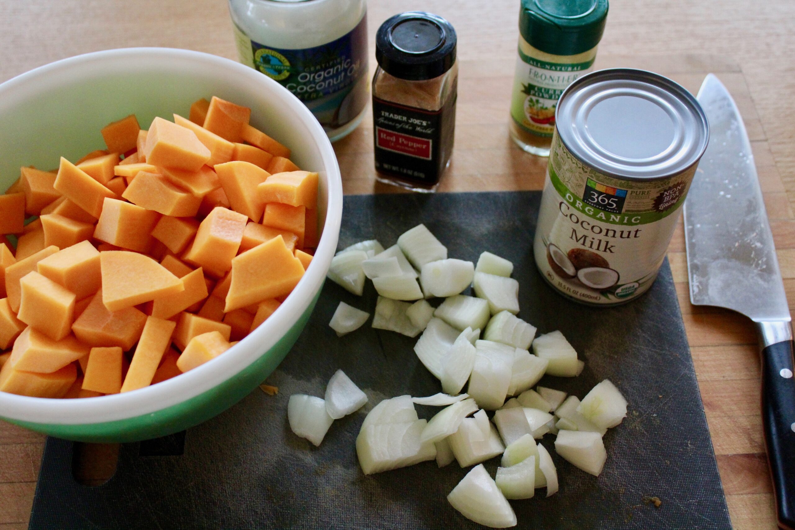 Add coconut oil and olive oil to a medium soup pot set over medium-low heat. When coconut oil liquefies, turn heat to medium, and saute onions, curry powder, cayenne, salt and pepper. Cook five minutes until onions are soft and spices are toasty.