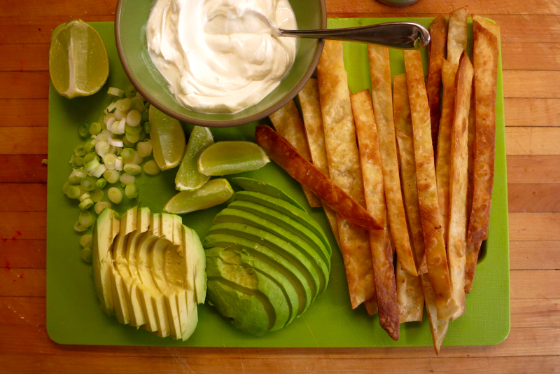 It’s all about the toppings really. None of which (except those tortilla strips) need to be cooked. Makes 4 servings. Feel free to substitute store-bought chips for the homemade ones.