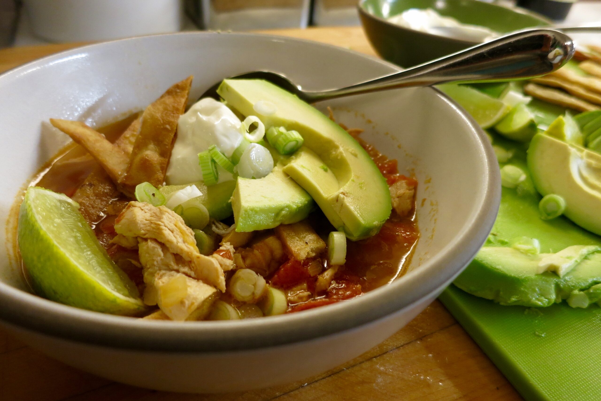 Add all toppings, including tortilla strips, to a platter or cutting board and place on your table. Ladle soup in bowls, squeeze the juice from one lime quarter into each serving, and have everyone customize his or her own bowl.