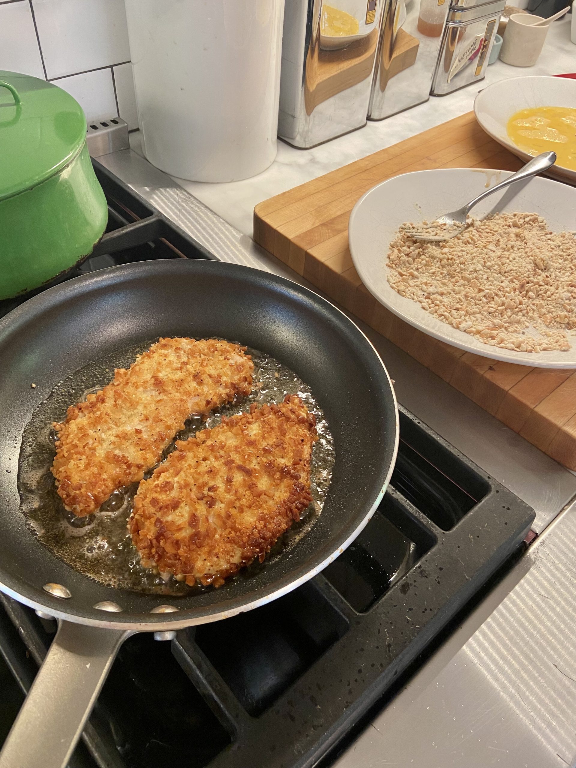 One of my more favorite mini NYC itineraries when the girls were little was a walk on the High Line, a stop at the magical Books of Wonder on 17th Street, then, of course, a hot chocolate (or the iconic “cold hot chocolate”) and pretzel croissant at City Bakery, just off NYC’s Union Square. For decades before it closed in 2019, City Bakery helmed by chef Ilene Rosen, seemed to a place I always just ended up — for outings with the kids, for business lunches and breakfasts (the lychees at the yogurt bar!), for coffee dates, for afternoon writing sessions when I started working for myself and all I needed to fuel myself was a plate of their famous pretzel-crusted mustard chicken, maybe a giant chocolate chunk cookie, and a table in the loft-like upstairs so I could have the best angle to people watch. I was thinking of this at dinnertime recently because my mom’s golden fried chicken cutlets were on the menu for Sunday Dinner, and as I was setting up my dredging stations I realized that I had just a few dusty bread crumbs left in my panko can. I know I could’ve whirled just about any kind of bread in the food processor to make homemade breadcrumbs, but a bag of Trader Joe’s honey pretzels inserted themselves into my line of vision and then, all I could see was City Bakery’s famous dish. The result, I texted my daughter at college, was maybe the best thing I’ve made all year. “It’s like the bougiest kids menu item!” she replied, and then, “I’m getting on the next train home.”
