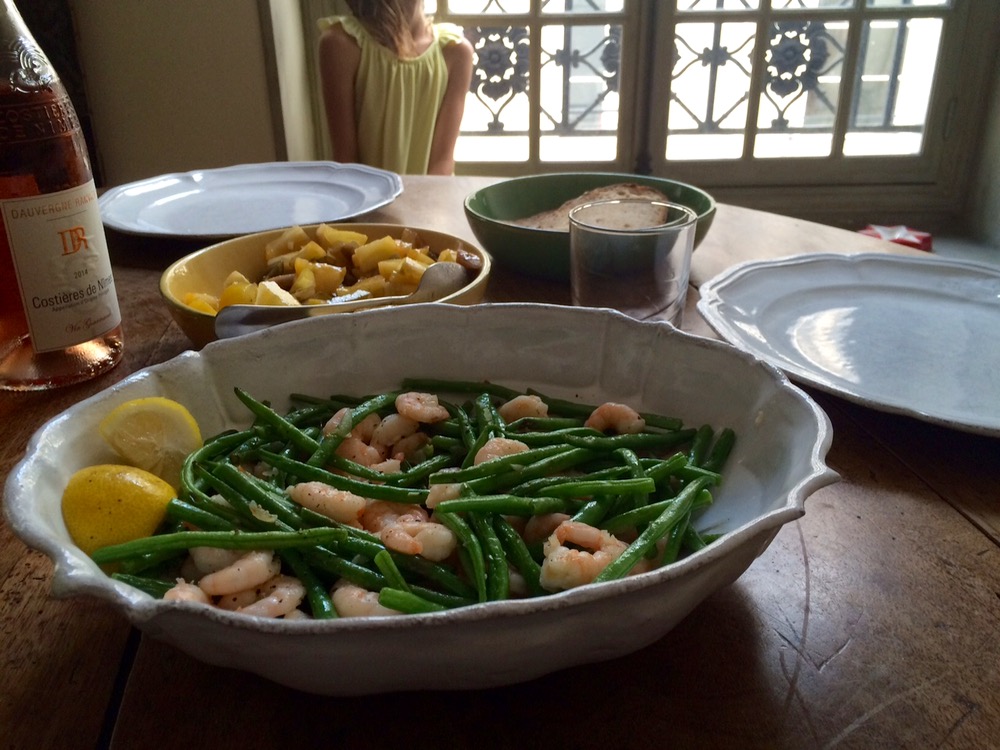 Scrolling through our vacation photos was like the visual equivalent of watching Bubba’s famous Forrest Gump monologue: Barbecue Shrimp. Creole Shrimp. Popcorn Shrimp. Pineapple Shrimp. Coconut Shrimp. Lemon Shrimp. Pepper Shrimp. Wow, we ate a lot of shrimp! This, of course, made perfect sense in South Carolina — where we spent the last leg of our trip, and where we usually feel like something is missing if cocktail hour has come and gone without a dozen jumbos on ice. It made less sense in Amsterdam and Paris, where you’d think we’d have way more photographic evidence of stroopwafels and saucisson. Either way, we struck on this winner one night that I thought might translate well across the Atlantic. Haricots verts were all over the markets, and when pan-fried with garlic, a little French butter (OK a lot of French butter), lemon zest, and sweet cooked shrimp, it was just the thing.