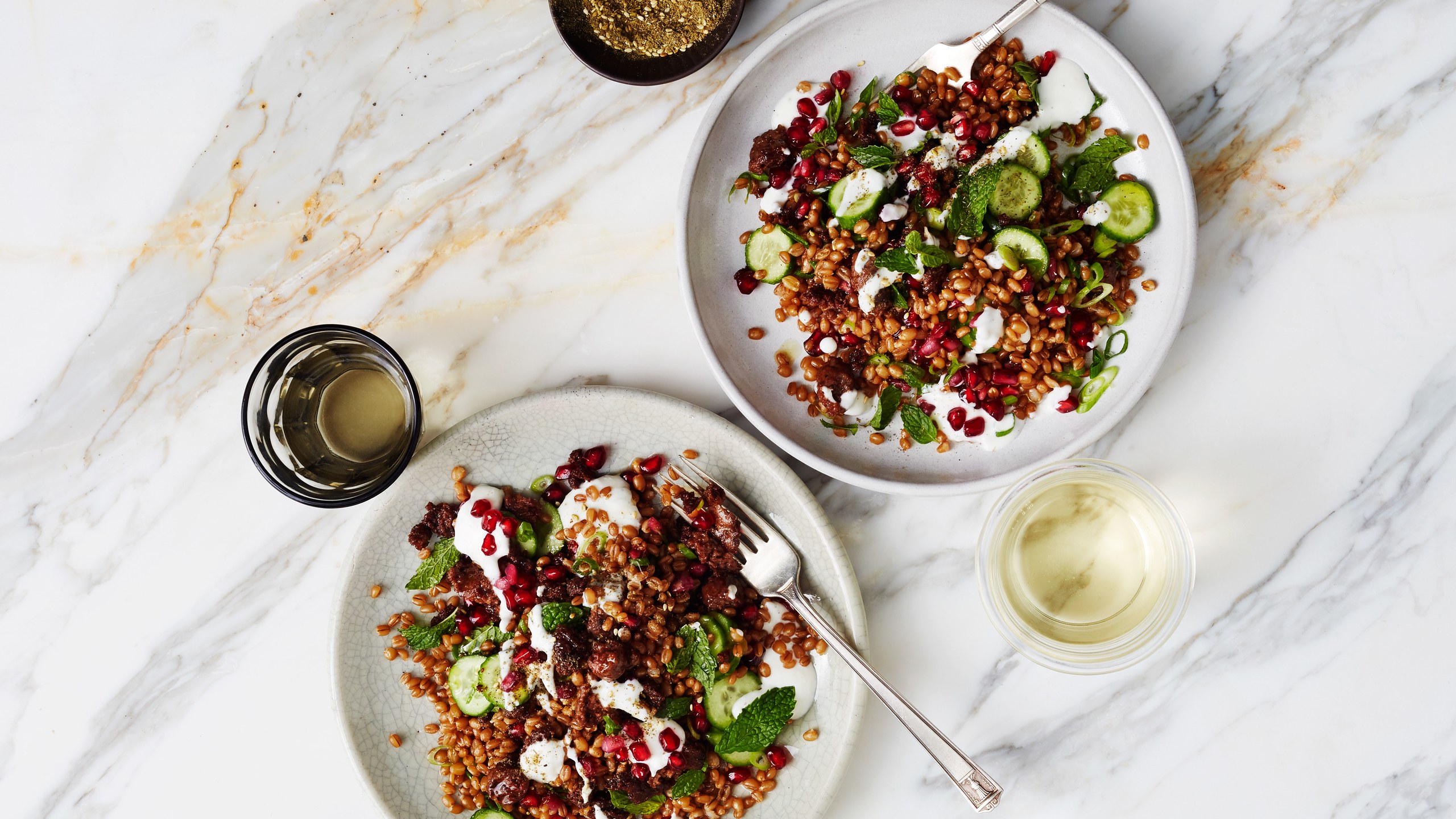 I like using wheat berries in this grain bowl — they’re nutty and firm and hold their own flavor-wise alongside the lamb — but you can also use quinoa or farro if that’s what you’ve got lying around. I toss in the crispy merguez crumbles, add mint, parsley, cucumbers for a cooling crunch, then a punchy yogurt dressing, and the result is a low-effort, high-reward dinner that earns regular rotation status, especially if I’ve been my best self and thought to prepare a batch of wheat berries the day before. (The grain simmers for just about an hour—remembering to do this in advance is the most technically challenging part of the recipe.)![]()