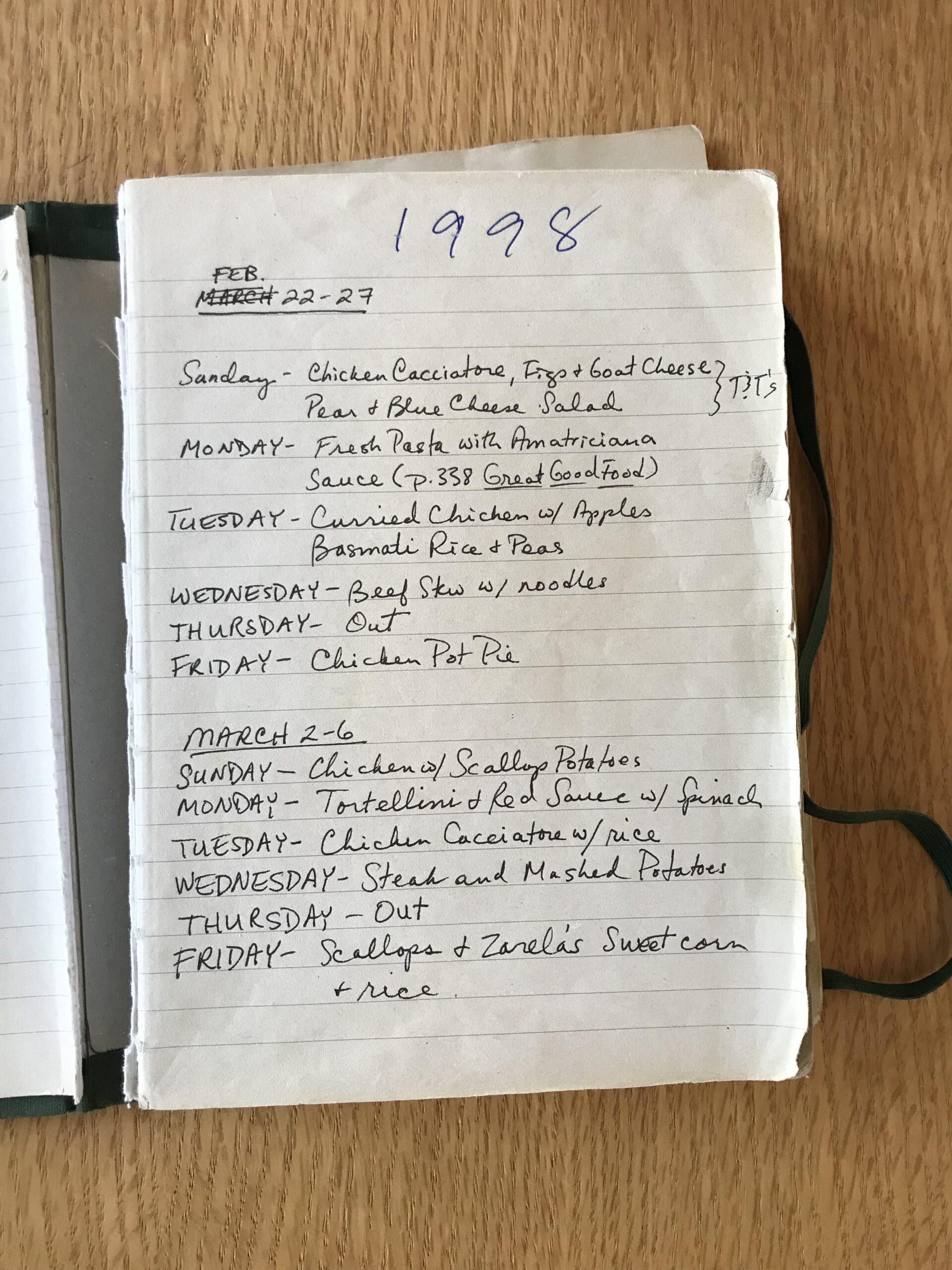 From the Archives: Page 1 of Dinner Diary, Volume 1. Chicken Pot Pie is still in the regular rotation, as are scallops. Inspired to start your own dinner diary? This’ll do.