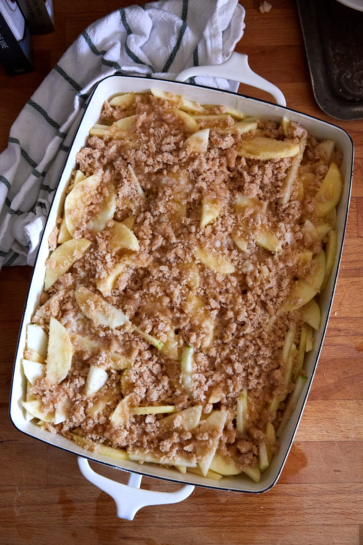 [Updated 2025] These days, I find myself reaching for a 9-inch pie dish as often as a 13-by-9-inch baking dish, which is what I called for using back in 2012 when I first typed this post. If this is you, you’ll only need about 4 cups of fruit filling. (A favorite combination for me is 3 cups peaches, or roughly 5-6 medium peaches, plus 1 pint blueberries.) You can scale back the topping to 3/4 cup for both flour and sugar, and to 4 tablespoons of melted butter for drizzling.