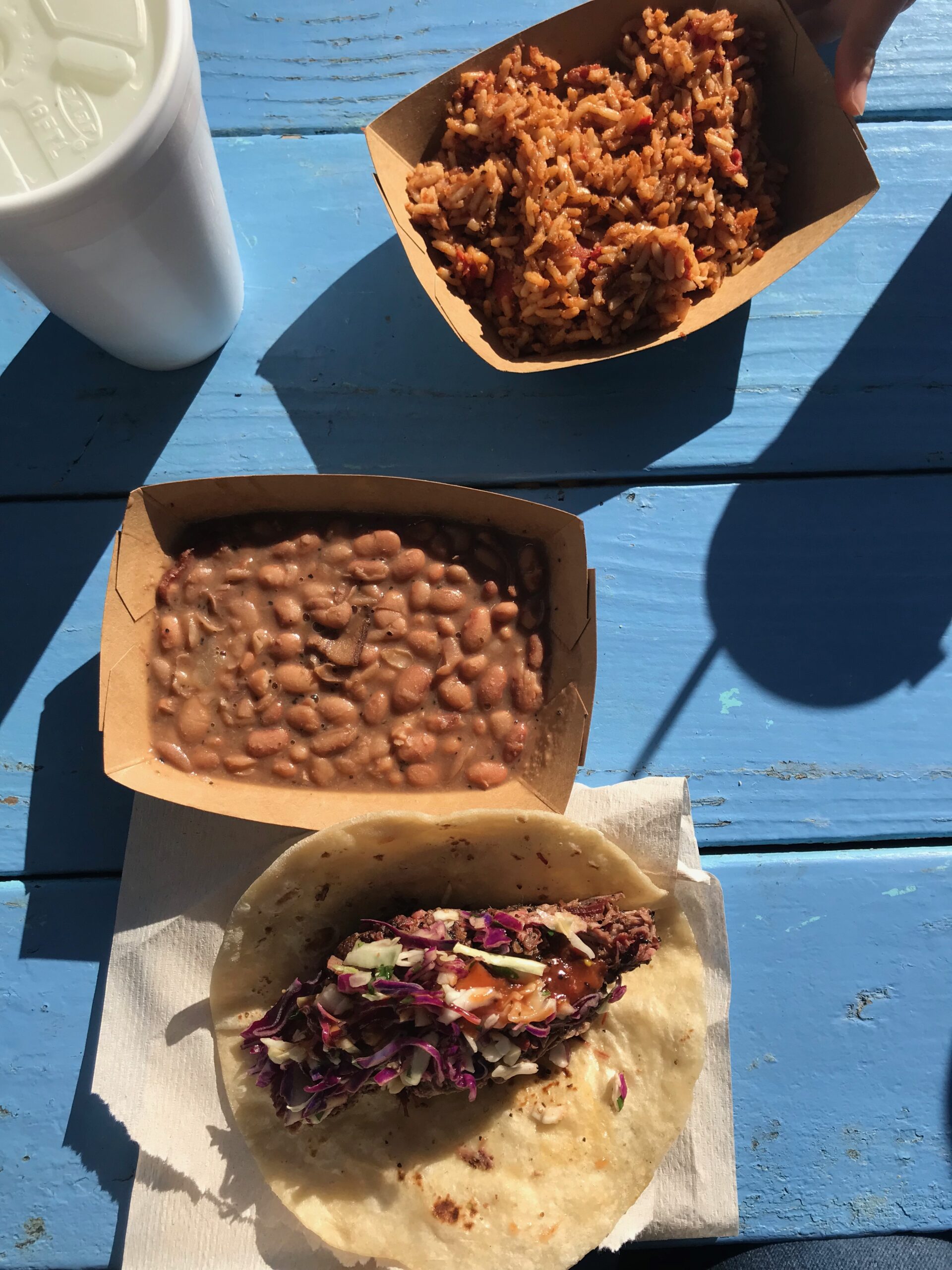 I went with a single chopped brisket taco and it was the best thing I ate all week. We also got beans, chips and guac, limeade, and Mexican rice, savoring everything on the first of many bright photogenic picnic tables. Do I need to tell you it was worth the wait?
