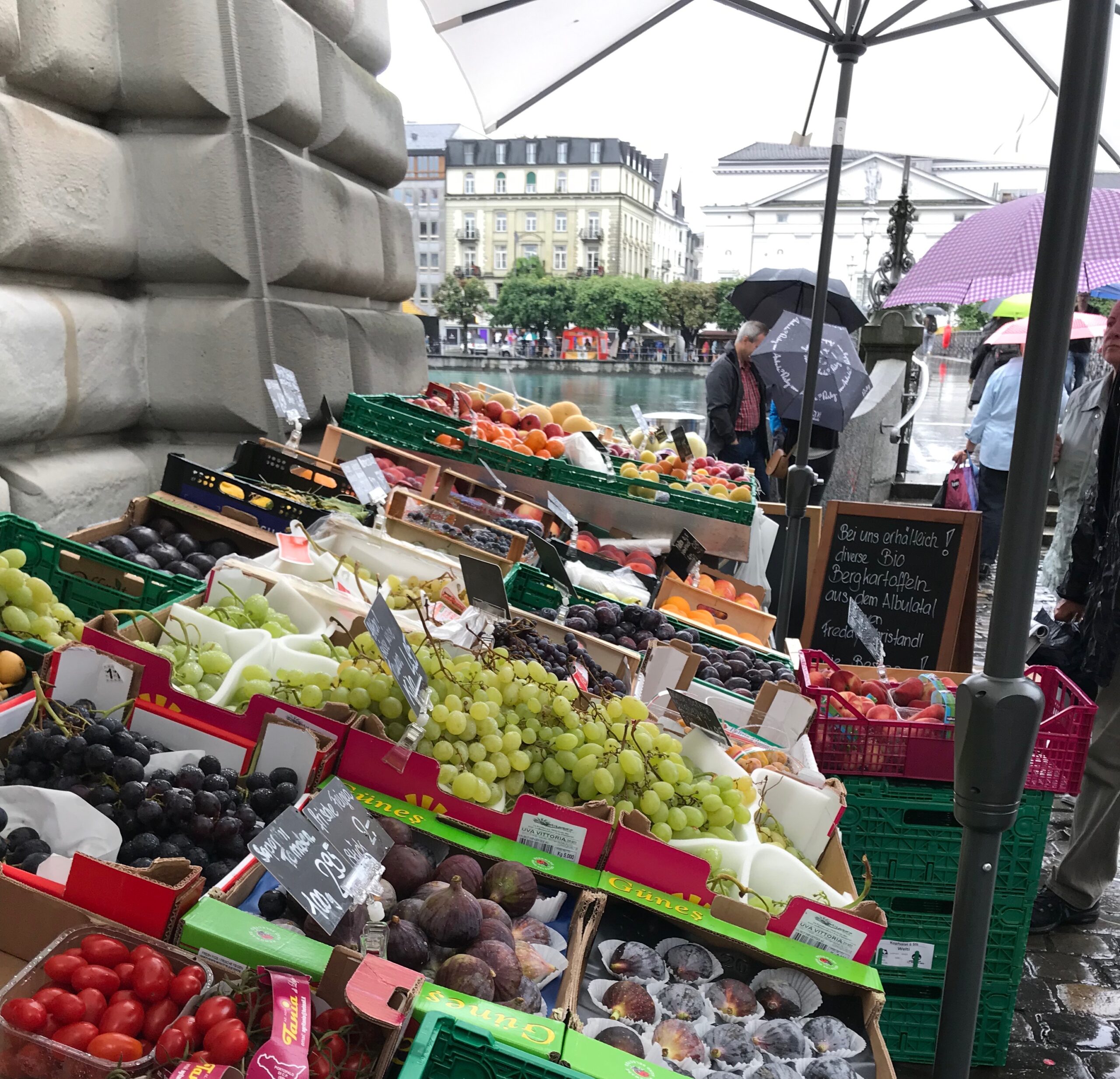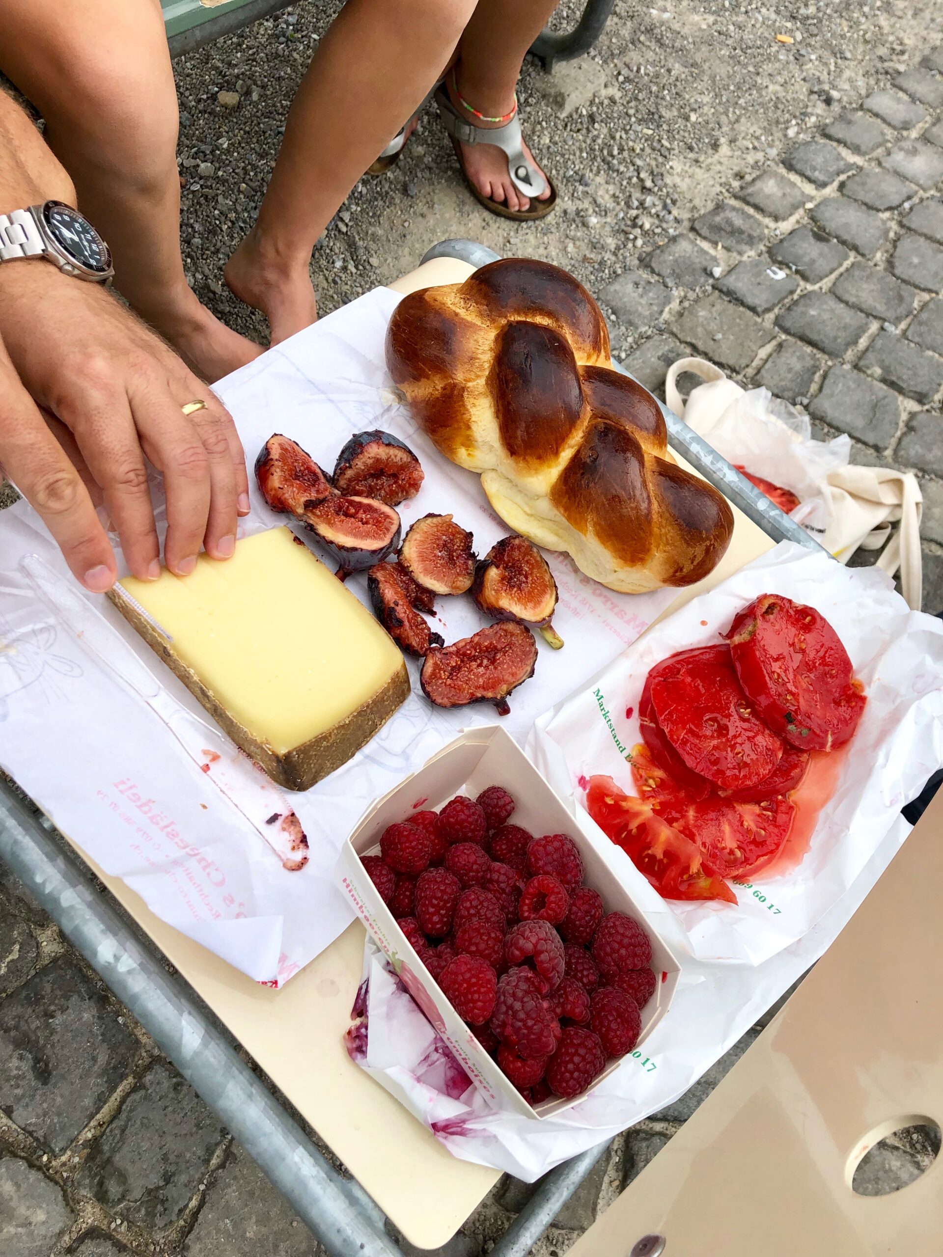 #2 The Markets I think it was because I hadn’t done enough research, but I wasn’t entirely sure what to expect in terms of the food. Everyone talked and wrote about the sausage and rosti, and the fondue and raclette and Ementaler and cheese and cheese and more cheese, which was, of course, amazing, but it didn’t exactly sound like light summery fare. What I had shamefully failed to realize was how robust the farm and farm market scene was. We planned our eating itinerary in Lucerne around Wochenmarkt, the massive market that takes over both sides of the Reuss river in the center of town. There were vendors selling fruits and vegetables, fish from the lakes, handmade pastas, hard and soft cheeses, sausages, jams, marmalades, honey, breads…whoa the breads. A week later in Bern we hit Bundesplatz plaza for the Saturday market and it was a similar case of sensory overload. I just loved the vibe there. All the locals brought their dogs, and wheeled their rollie bags to stuff them with enough fresh food to last for days.