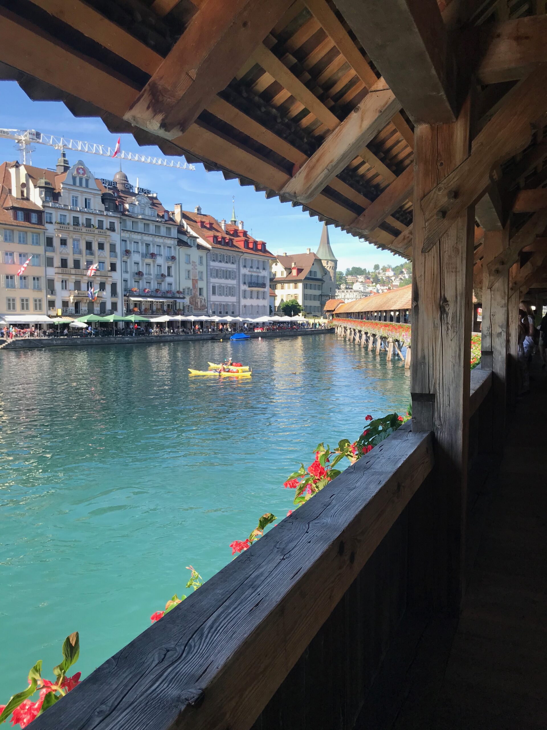 Here’s a shot of the Reuss River in Lucerne, taken from Kapellbrücke, the covered “chapel” bridge. Not even the eight thousand tourists could ruin it for me.