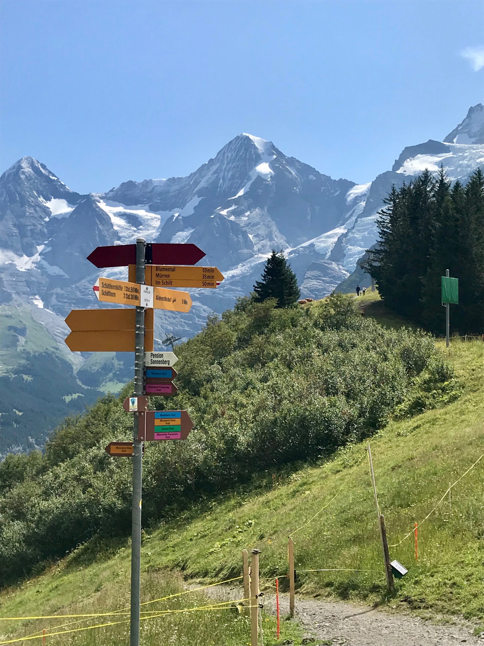 It was a little overwhelming trying to pick our hike, but we settled on the Schilthorn trail which promised vistas and not a super high degree of difficulty. One thing that I really appreciated was the unbelievably clear signage along every trail. At the beginning of each trail, signs tell you exactly how many hours or minutes it will require and then along the way, there are painted rocks and more yellow signs and arrows so you never felt lost or confused.