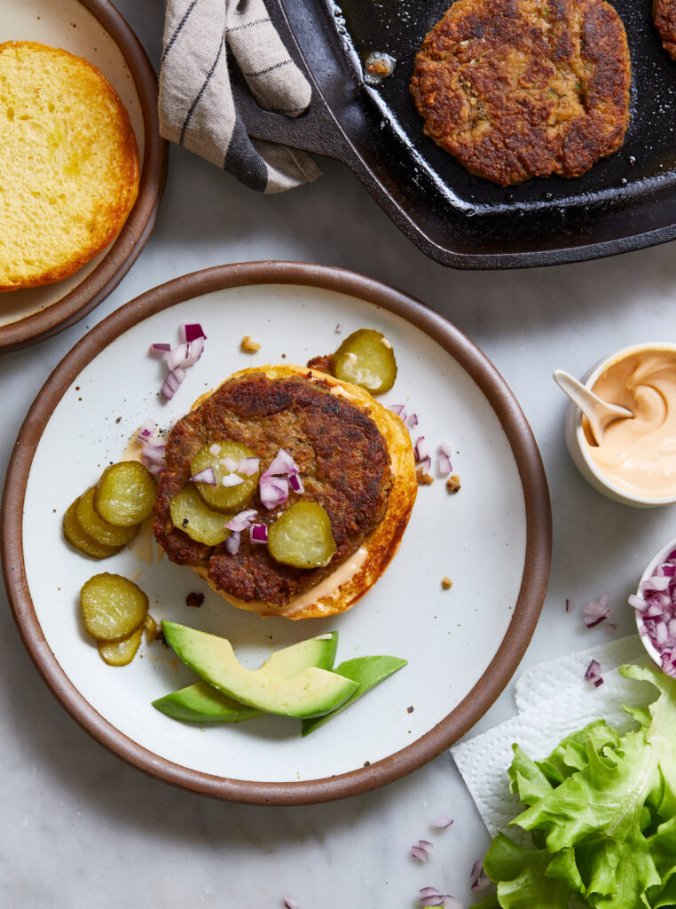 This was not easy or fun—in fact, if you ever meet my daughters, you might not want to mention the bean-burger phase of testing to either of them. (Though maybe they’ve blocked it out?) Eventually, I landed on this recipe, which tastes more like a burger and less like a bean. It was originally inspired by a recipe from Sprouted Kitchen’s Sara Forte, one of my great heroes of plant-based family cooking. Like many veggie-burger recipes, hers relies on the depth of cooked-down mushrooms and is based on black beans, which I’ve tried and loved, but I knew the diners at my table— the little ones, at least—would more likely respond to a milder pinto-based burger that also resembled the color of a burger. I was right. And they weren’t the only ones who responded favorably. Christine Han, the lovely and talented photographer who shot every picture in The Weekday Vegetarians (including the one you see above) told me she couldn’t stop thinking about the burgers after eating them at our photo shoot. (When we wrapped, I gave her four frozen patties as a thank-you gift.)