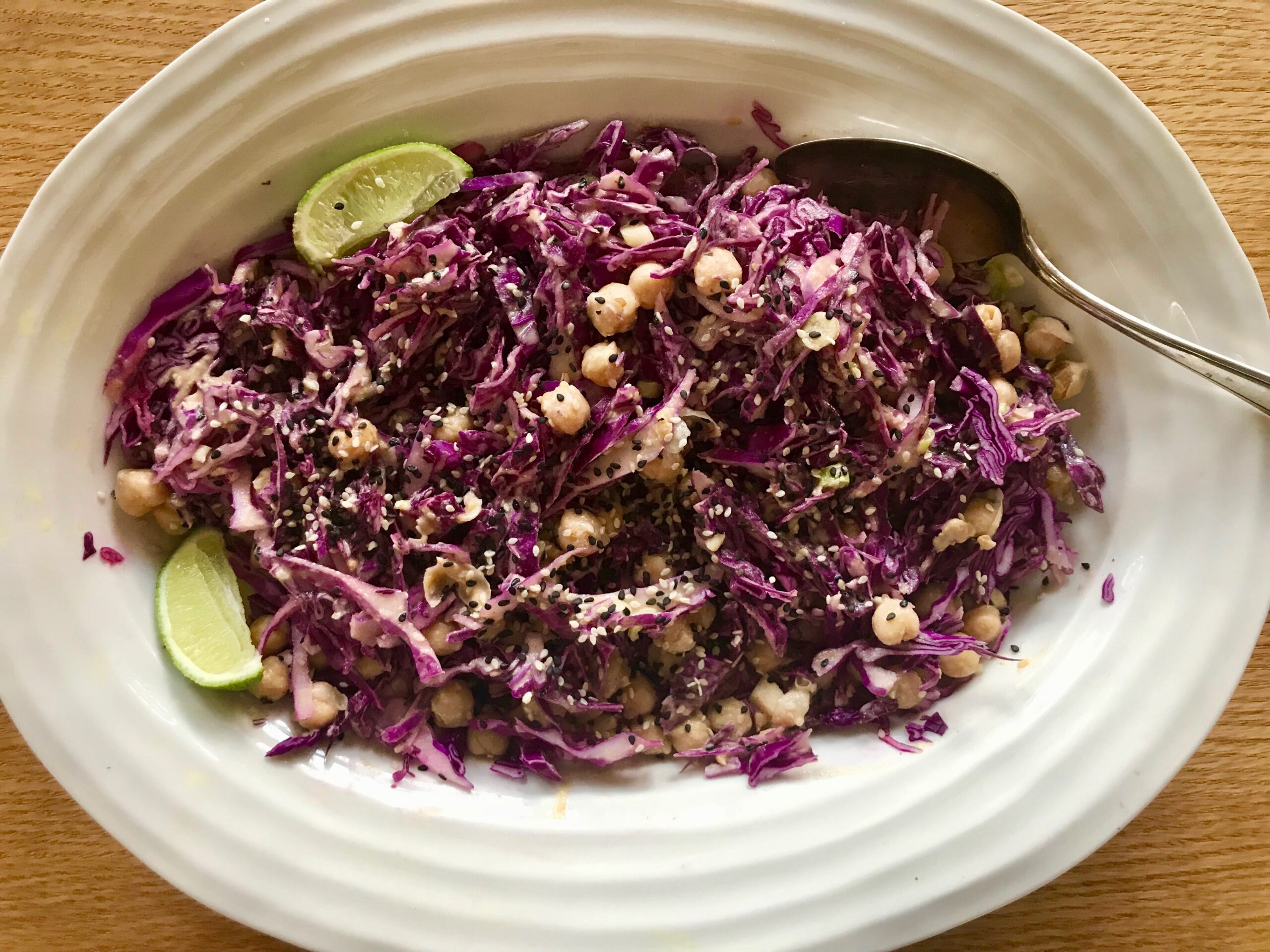 Red Cabbage and Chickpeas with Spicy Tahini Dressing. The tahini dressing calls for harissa and is my new go-to.
