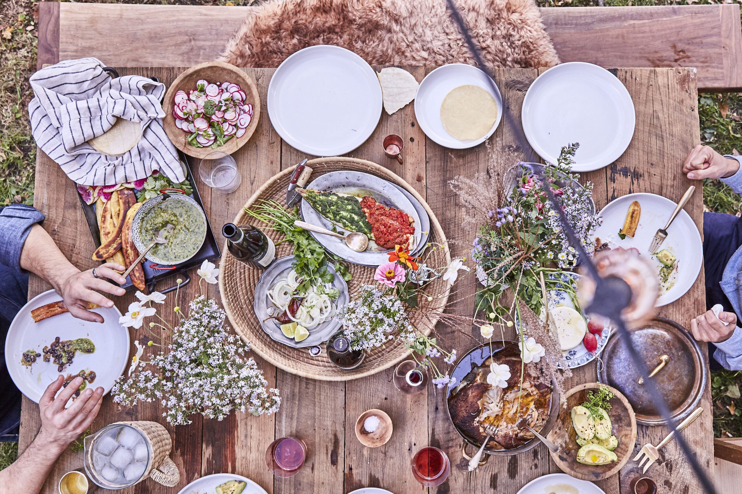 In the summer, I always serve tacos–a big piece of pulled pork that’s been slow cooked in beer (ahead of time, naturally), plus rice and beans (above) for our considerable vegetarian crew. Then I spend most of my energy on the fixings: everything from pickled onions and vegetables, my potent and versatile green sauce (in my book), to a huge kale slaw that all squeeze into tortilla after tortilla without any flavor fatigue. This goes well with beer and rosé alike, and is a great all-in-one, no courses or running back in to the kitchen required. For dessert, an ice cream cake or semi-freddo pleases the masses and wins in the prep category since it can also be done ahead, giving you complete focus on great conversation, roaring bonfires and those flittering young souls gliding through summer with ultimate ease.