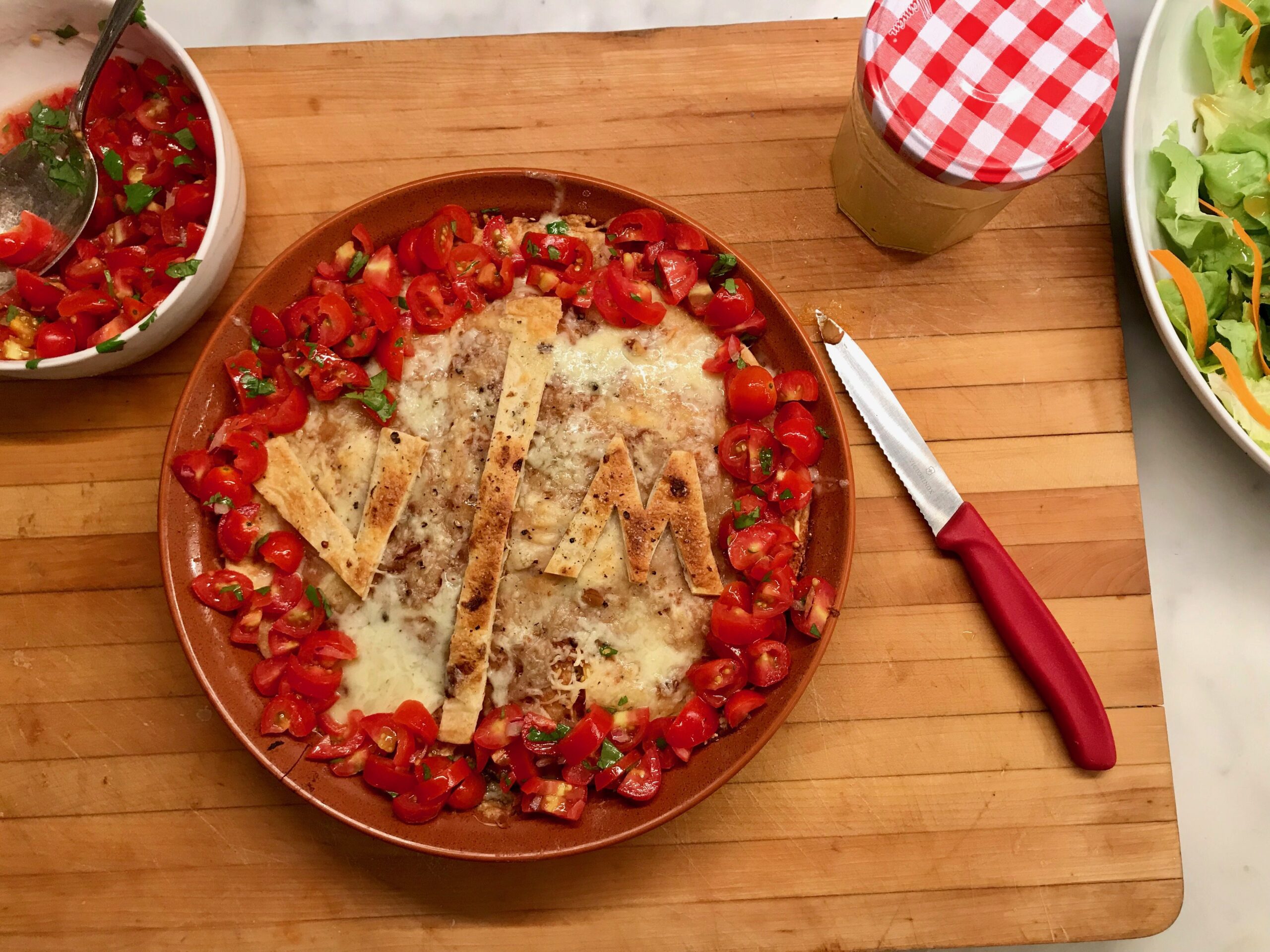 Heat oven to 400°F. Alternate layers of tortillas, cheddar, scallions, jalapeños, corn, and refried beans (you’ll want to spread the beans as opposed to dolloping them), cutting tortillas into pieces that work with the shape of the pie dish. On one side of the pie, add pork/chicken/sausage as you go, too, keeping track of the side that is meat-friendly. For the final layer, add a tortilla and a handful of cheese, then demarcate the meat-side with a strip of tortilla and an “M” monogram as shown. Bake 25 minutes. Cut into slices and garnish with toppings. I served with a simple green salad.