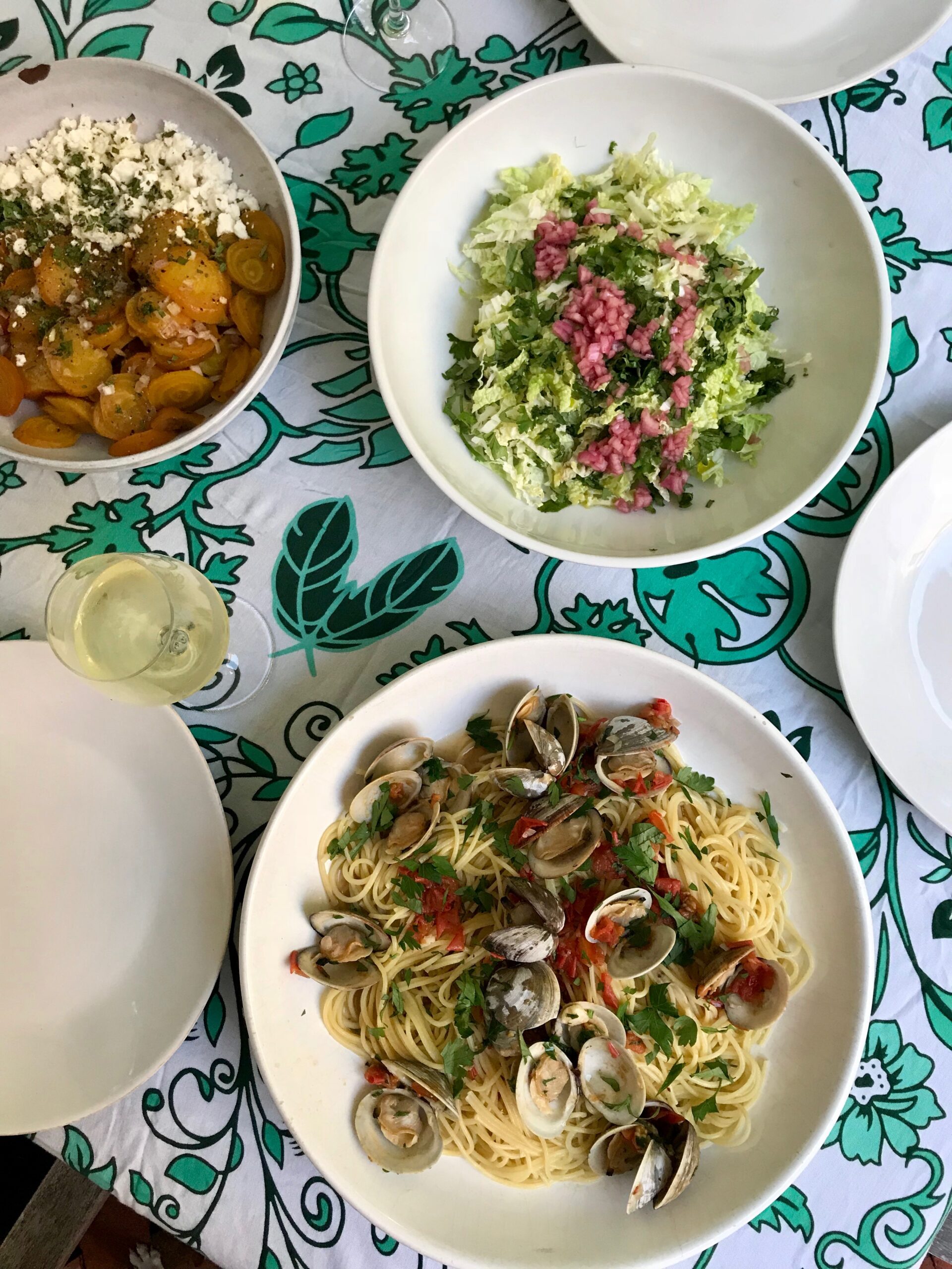 Old-timer readers will take one look at this photo and recognize that main dish as DALS MVP Spaghetti with Clams and Extras. It’s on page 56 of my first book, Dinner: A Love Story, and has made countless appearances on my summer table and instagram feed. I would be willing to bet almost anything that if you check back with me in 25 years, I’ll still be making it as often as I can in July and August. Why? Because hi-qual clams in an ocean of briny broth shout SUMMER and the whole recipe shouts SIMPLE, especially when paired with a Napa-based slaw and a golden beet salad, both of which are fresh and flavorful enough to require minimal intervention on behalf of the cook. For those of you who view clams as a page-turner, I beg you to face your fears and try it anyway. To help you along, I even made a shopping list, which was so short, I found myself cross-checking back and forth eight times. This can’t be right, I kept saying. But then I remembered we’re talking summer cooking here: Of course it’s right.